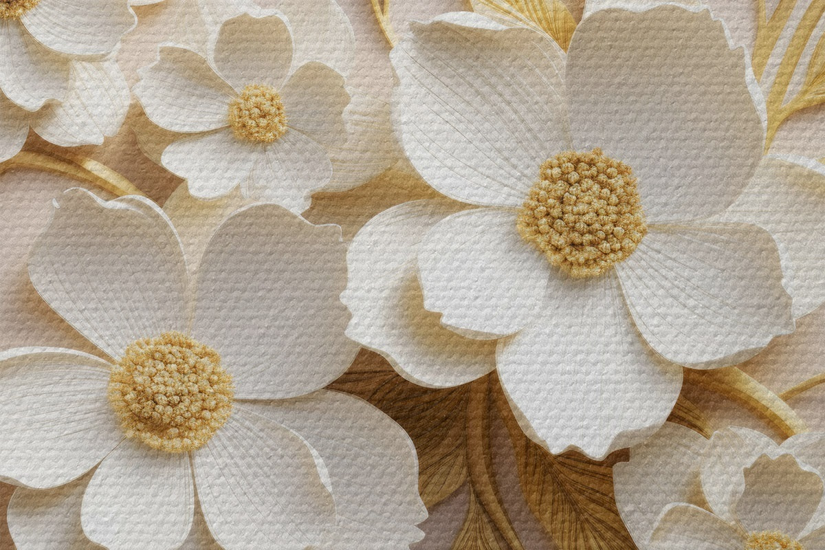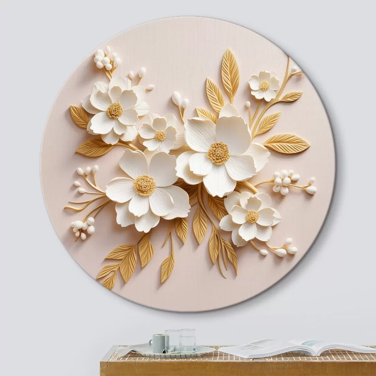 Runde Wandbilder 3D weiße Blumen mit Blättern auf einem cremefarbenen Hintergrund r43383