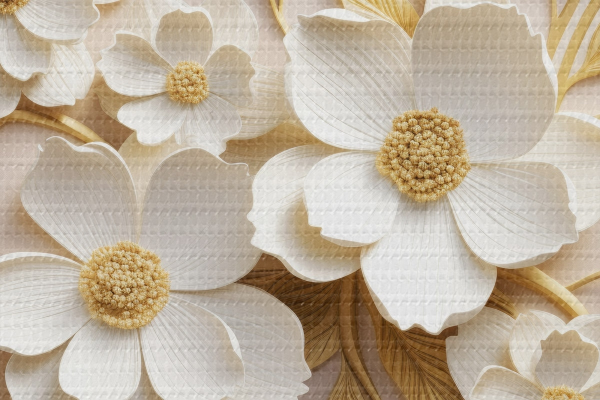 Runde Wandbilder 3D weiße Blumen mit Blättern auf einem cremefarbenen Hintergrund Nr r43383