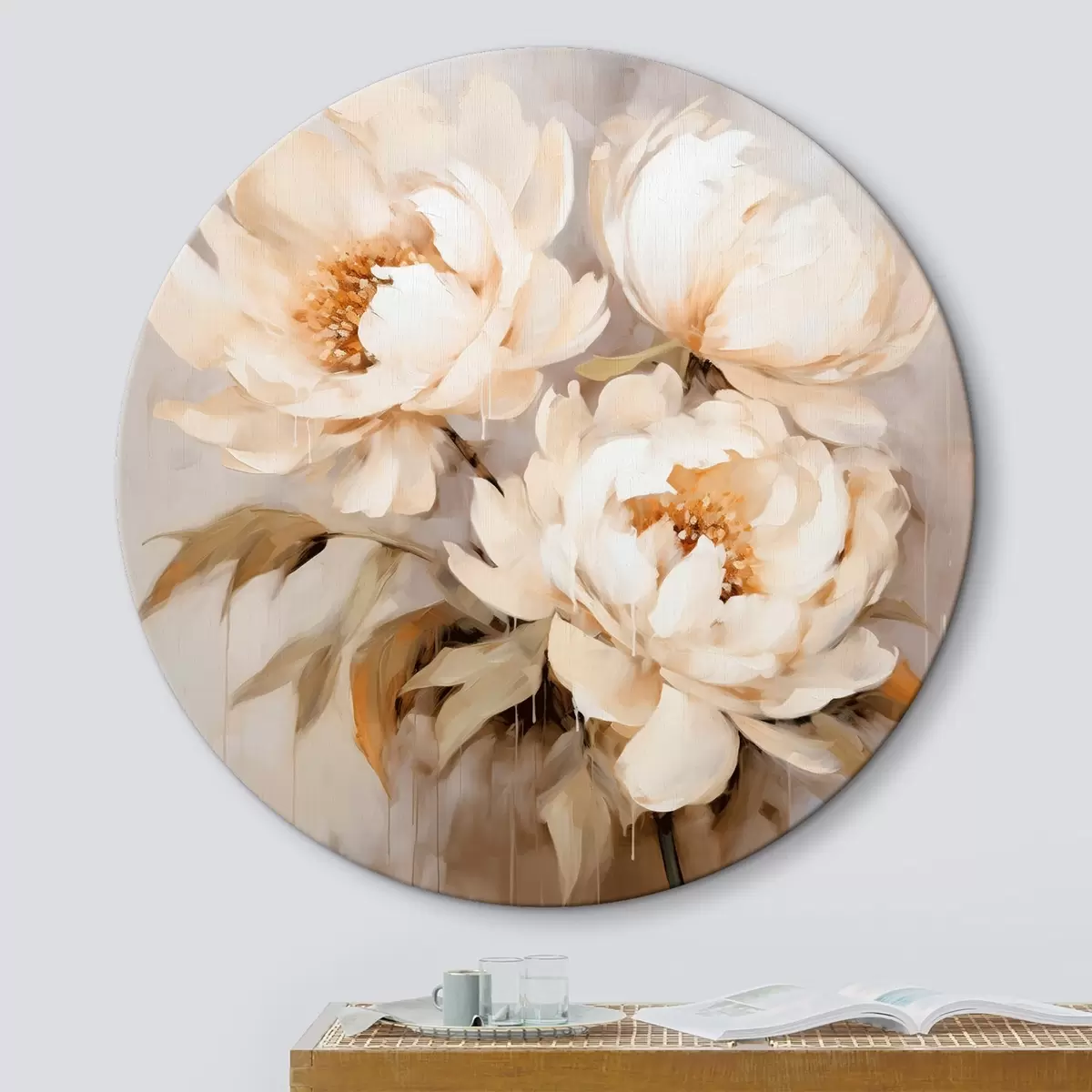 Runde Wandbilder Zarte Pfingstrosen in neutralen Tönen im Stil abstrakter Malerei Nr r43387