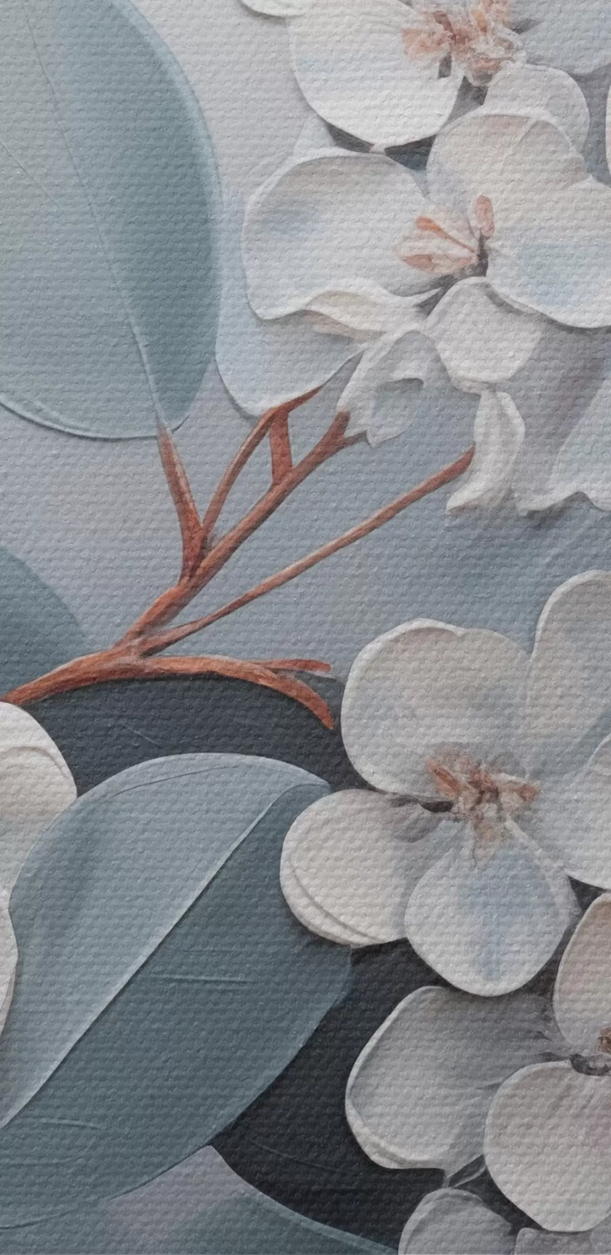 Runde Wandbilder Ein Zweig mit weißen Hortensienblüten in voller Blüte, mit blauen Blättern auf hellgrauem Hintergrund, Ölgemälde r43391