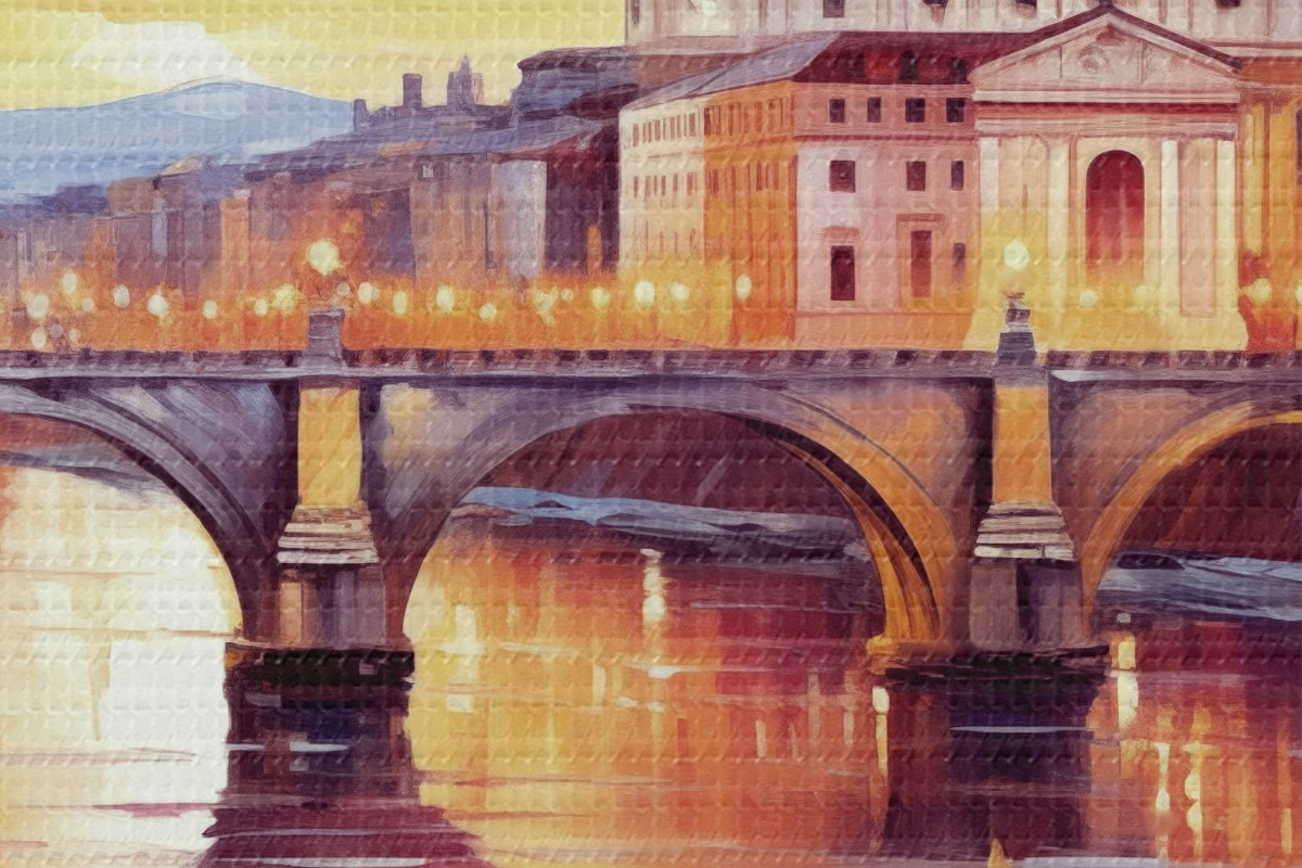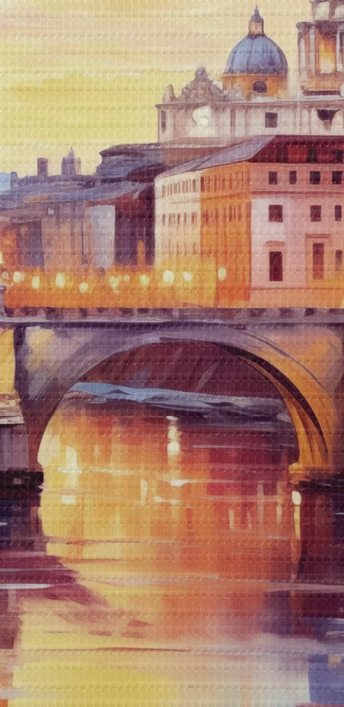 Runde Wandbilder Petersdom und Brücke über den Fluss bei Sonnenuntergang, warme Farben, Reflexion im Wasser, Ölgemälde Stil Nr r43396