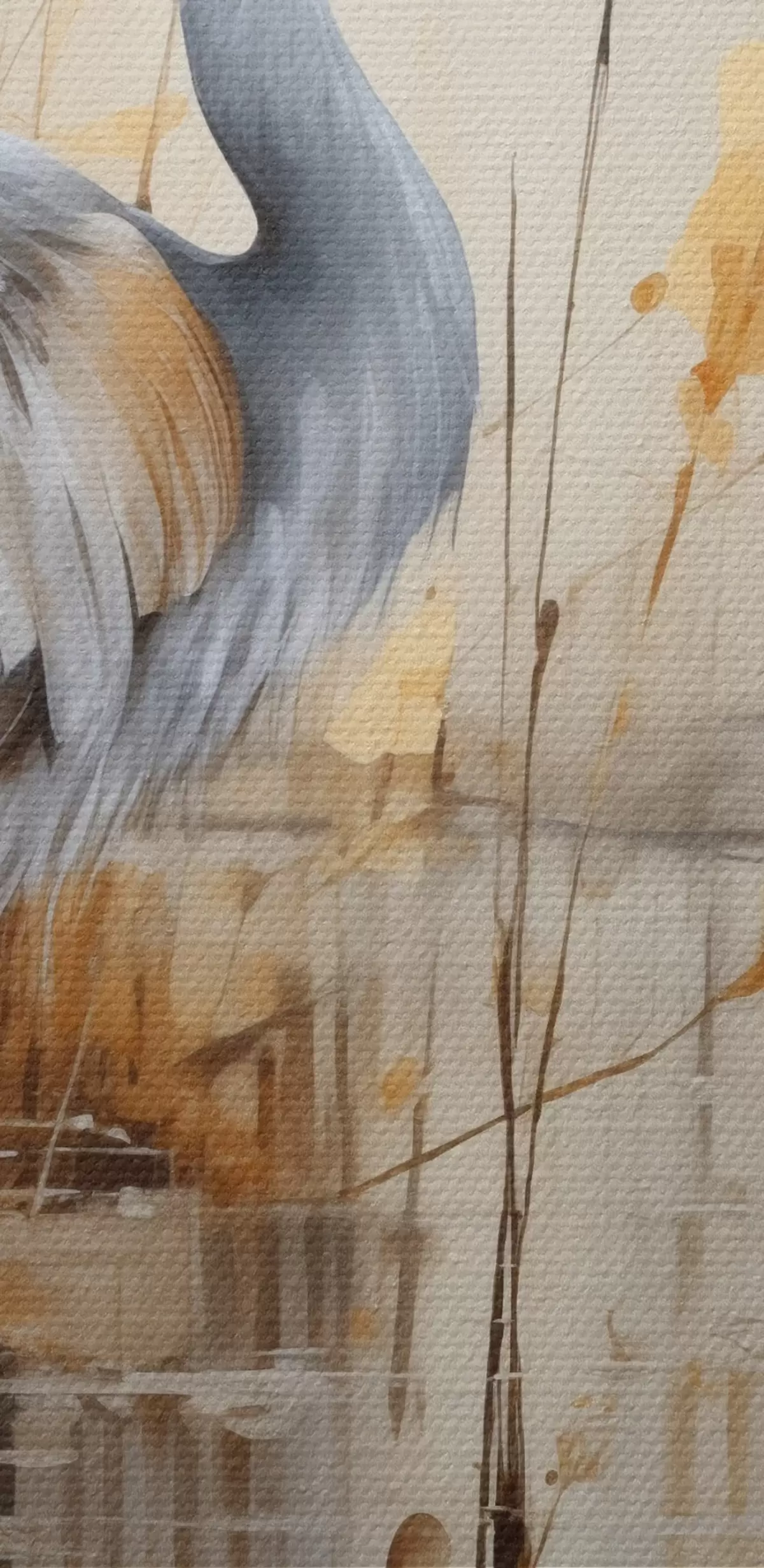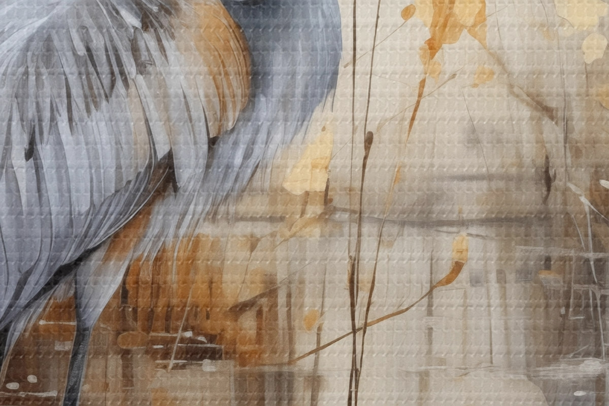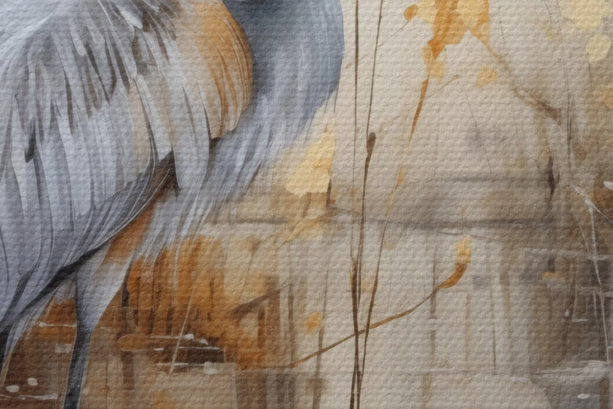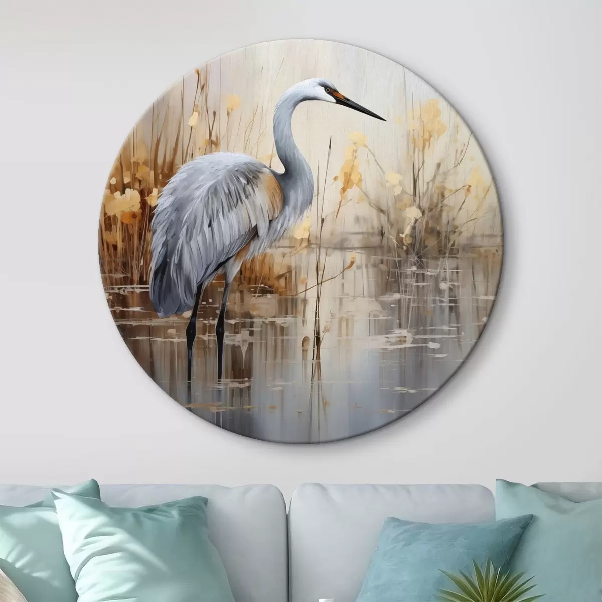 Runde Wandbilder Ein Graureiher steht in einem Teich, umgeben von hohen, dünnen Pflanzen, der Hintergrund ist eine weiche Mischung aus Beige und Weiß Nr r43398