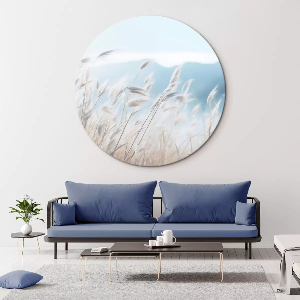 Runde Wandbilder Gras, Pampa Feld mit einem blauen Berg im Hintergrund, hellblauer Himmel, minimalistisch, Pastellfarben r43404