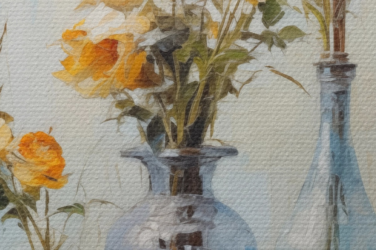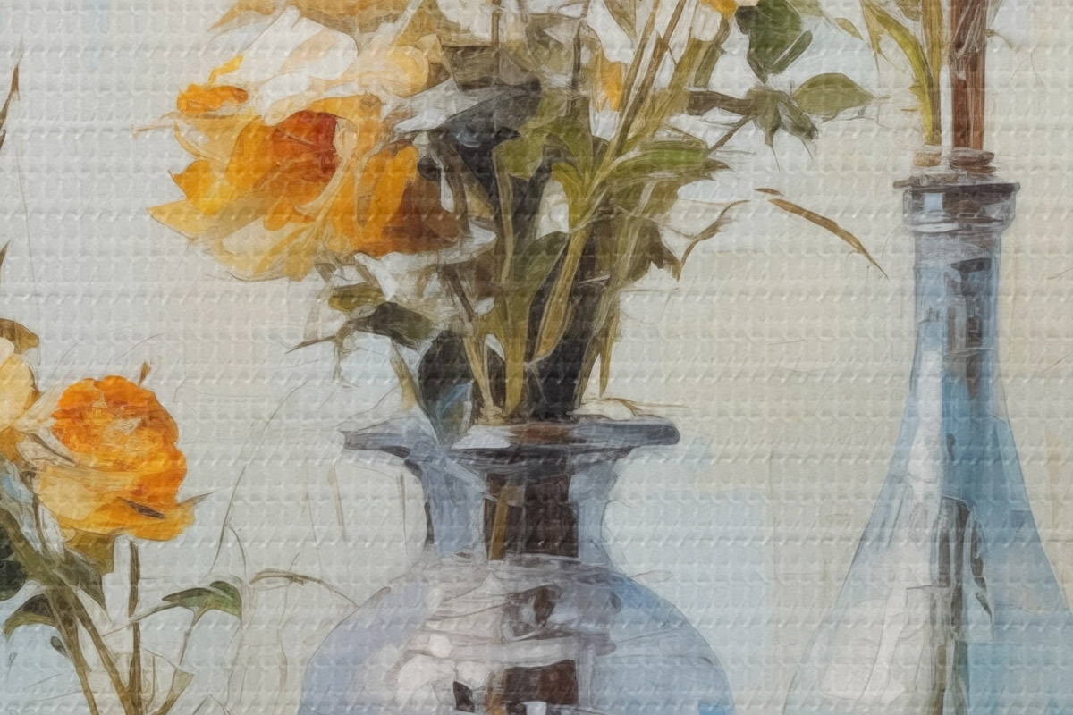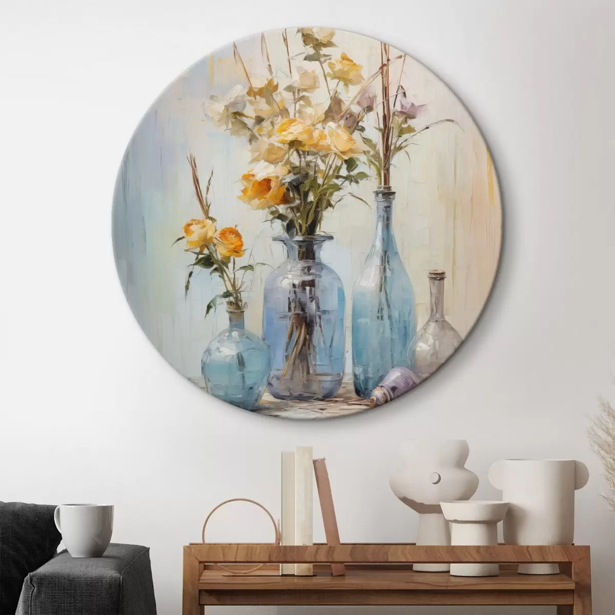 Runde Wandbilder Ein Stillleben mit gelben Rosen in blauen Glasvasen, heller strukturierter Hintergrund, weiche Pinselstriche, Ölgemälde-Stil r43409