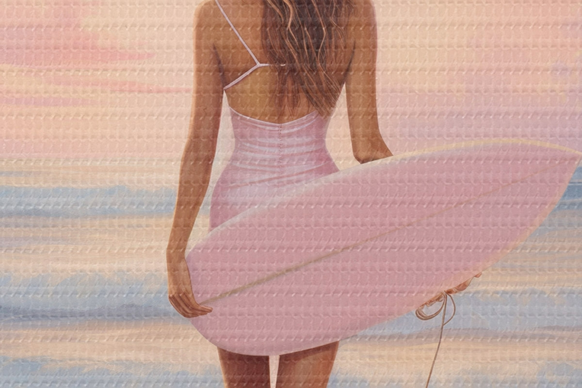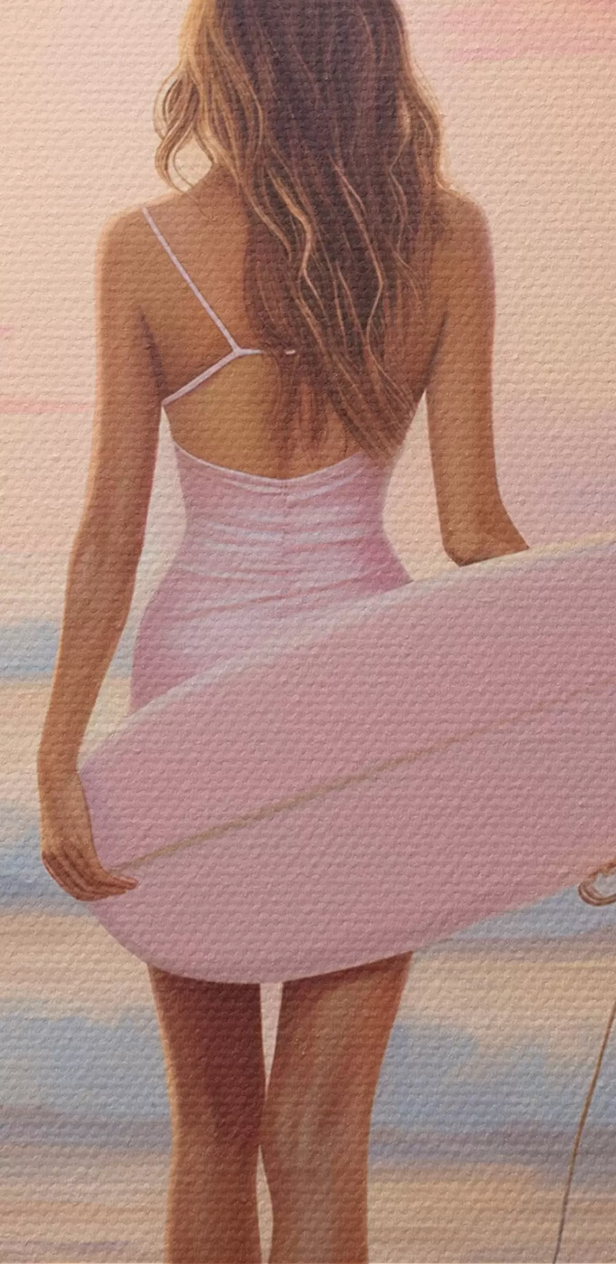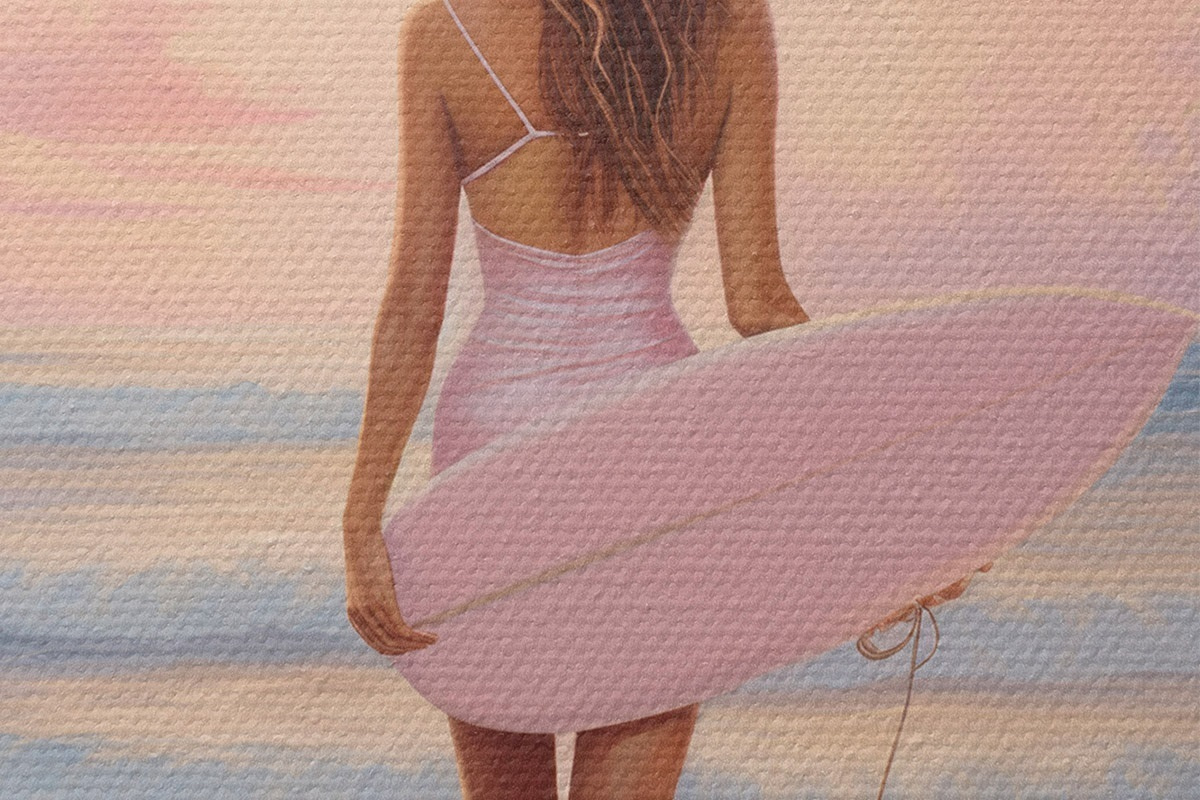 Runde Wandbilder Mädchen mit Surfbrett auf dem Ozean Strand, Sonnenuntergang, Acryl-Stil Zeichnung r43881