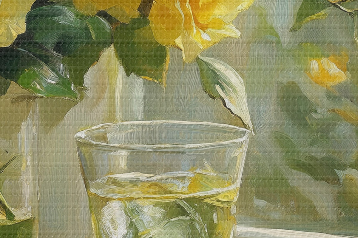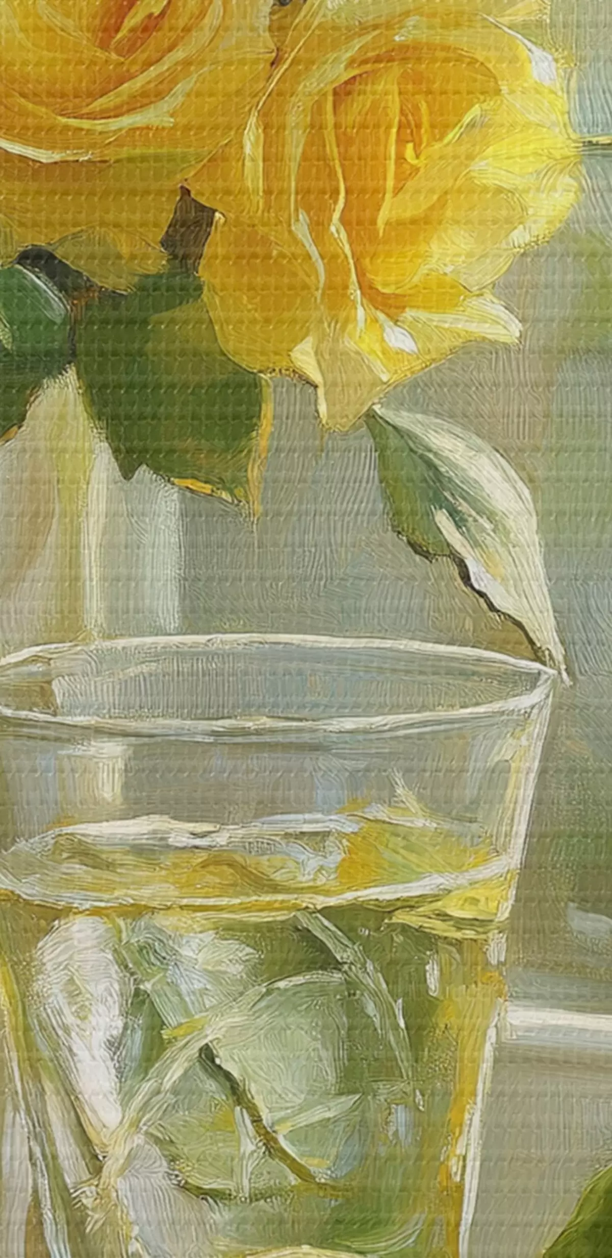 Runde Wandbilder Schöne gelbe Rosen in der Vase neben dem Fenster, Wasser mit Limetten Nr r43886