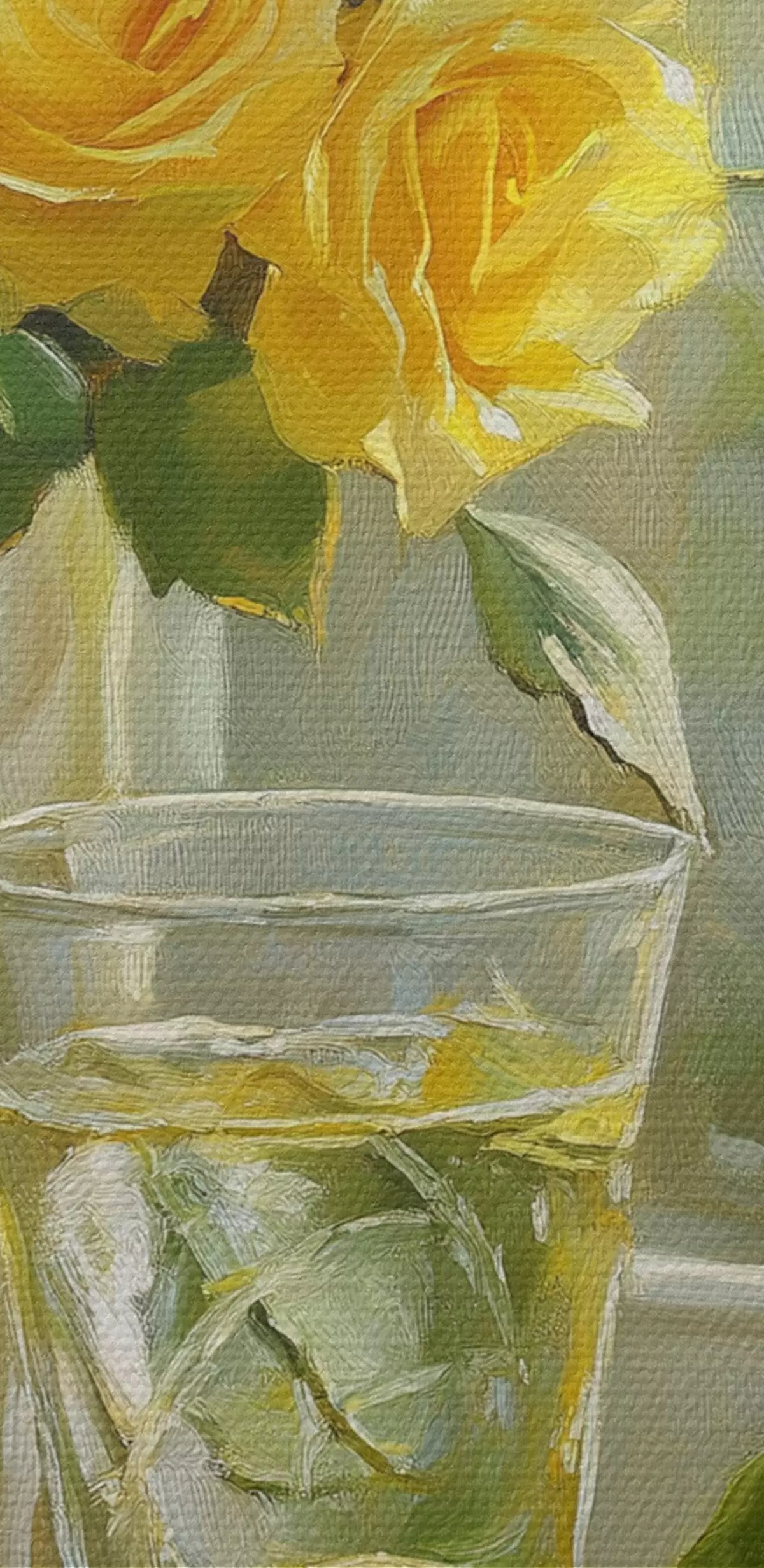 Runde Wandbilder Schöne gelbe Rosen in der Vase neben dem Fenster, Wasser mit Limetten r43886