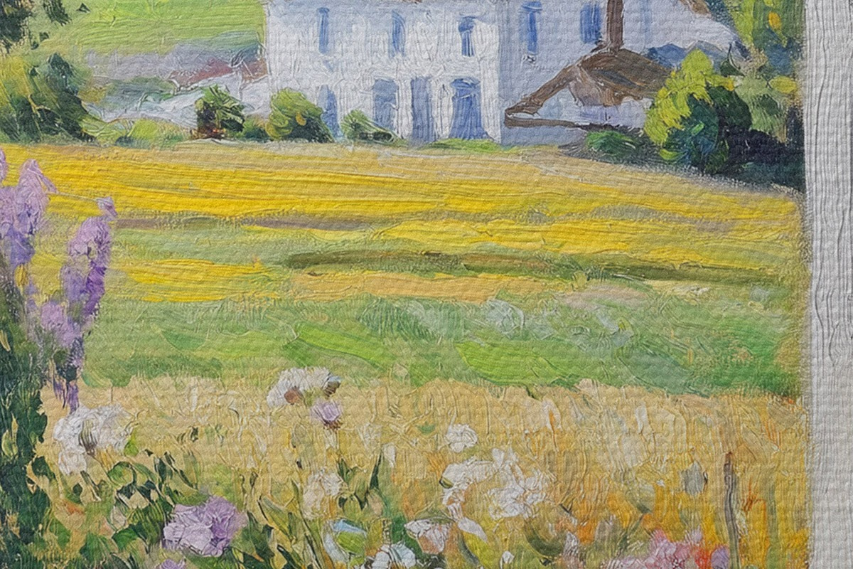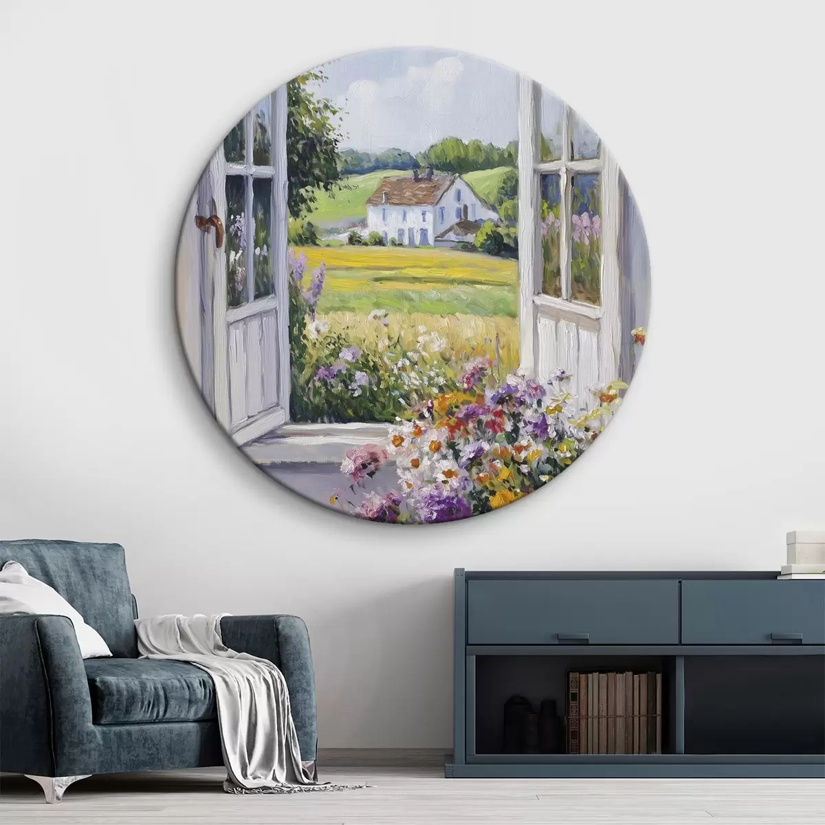 Runde Wandbilder Dorflandschaften im Holzfenster, Blumen, Felder, Öl-Stil, Bauernhaus r43888