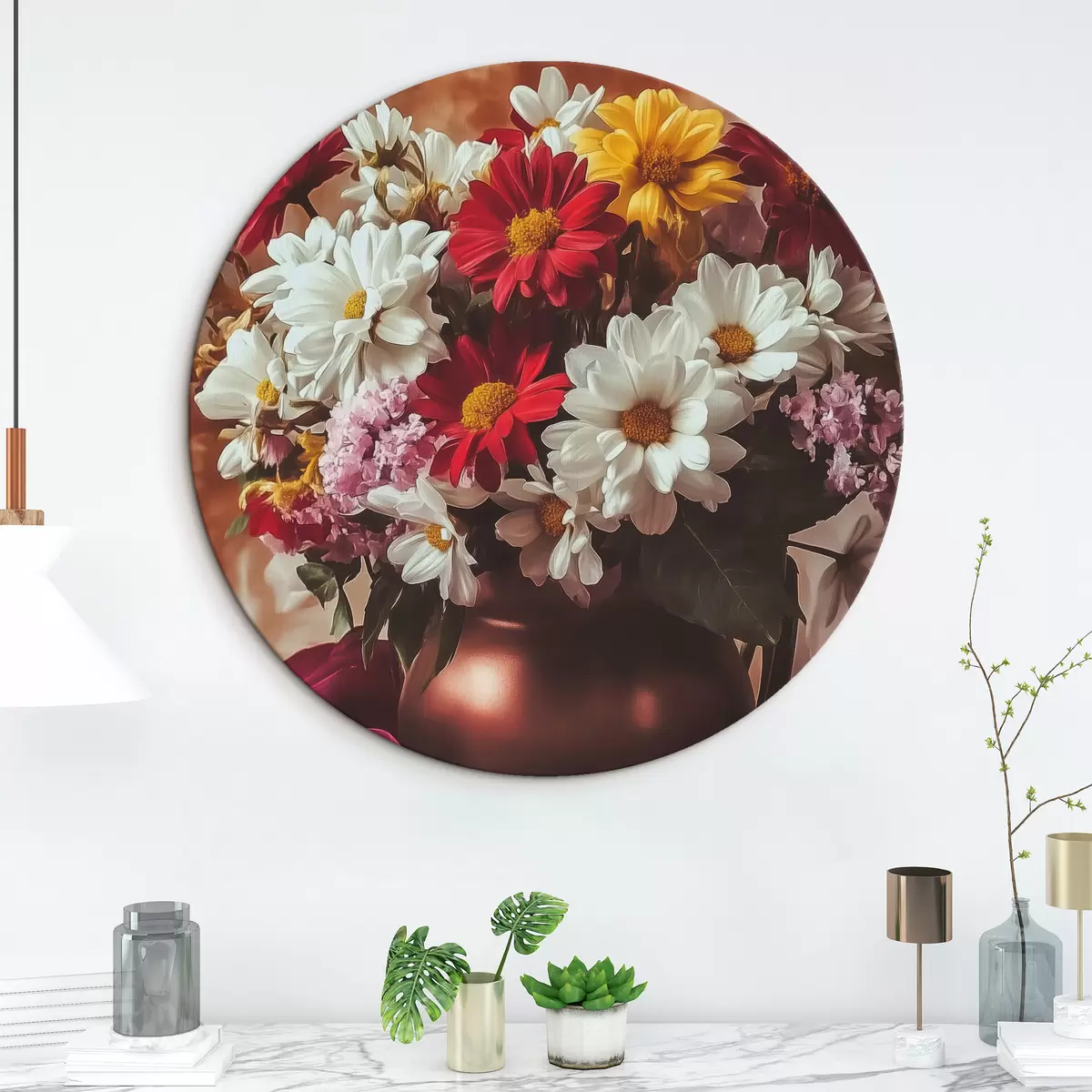 Runde Wandbilder Blumenstrauß in einer Vase auf einem beigen Hintergrund r43910