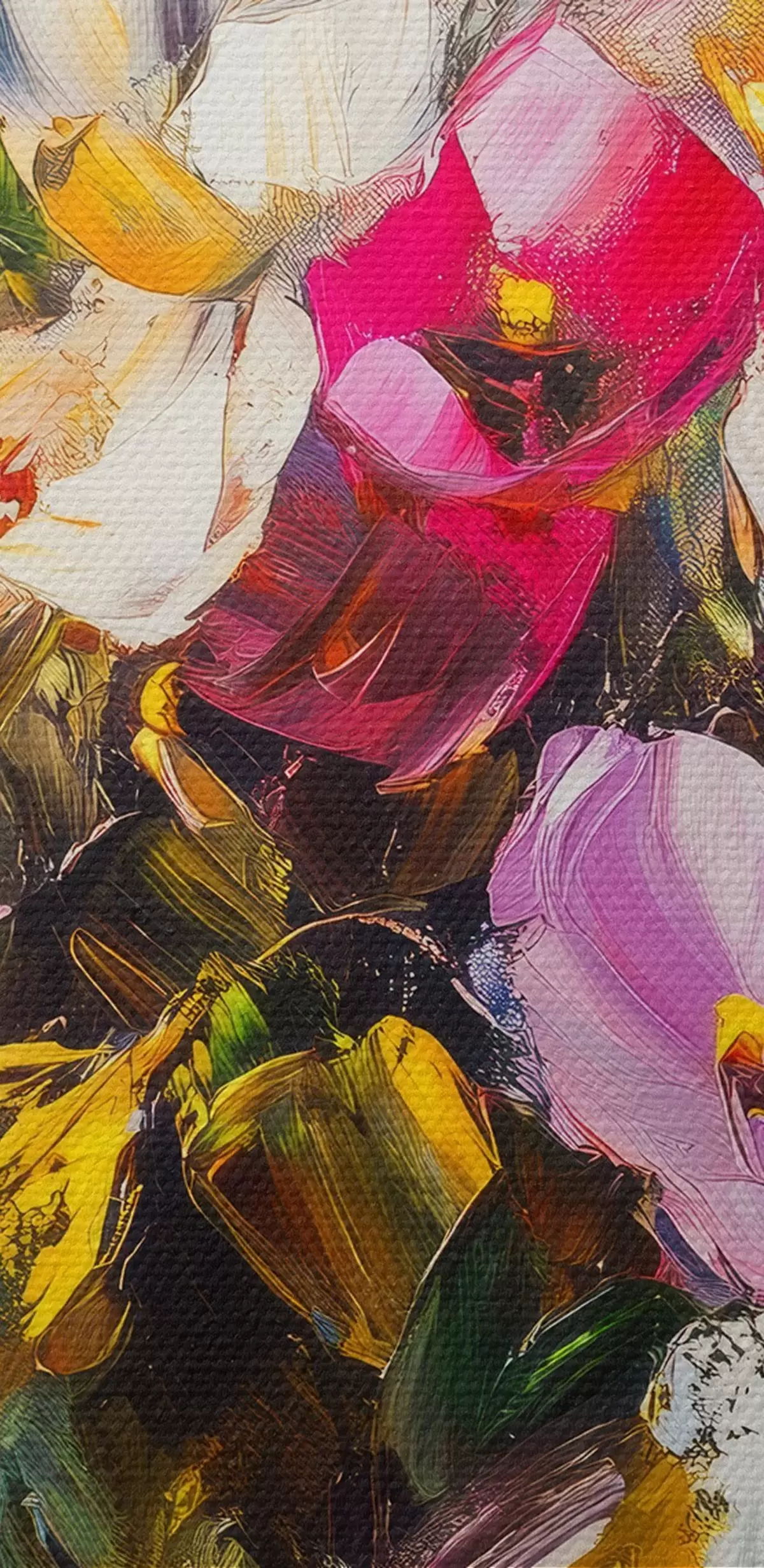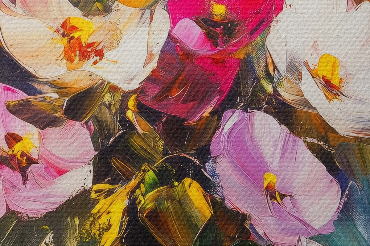 Drei Materialtypen stehen zur Verfügung: Economic Canvas - ein dichtes und haltbares Material für den Digitaldruck, identisch mit Malerleinwand, wasserfeste Oberfläche, realistische Wiedergabe von Details, mittelkörniges Material. Premium Canvas - die Textur ähnelt der einer Malerleinwand (verwobene kleine Fäden). Weiche, detaillierte Wiedergabe des Bildes auf einer matten Oberfläche. Eco-Premium - hochwertiges Gewebe aus 100% Baumwolle. Dank der natürlichen Baumwollfasern ist das Material langlebig und verschleißfest. Hervorragende Farbwiedergabe und Detailtreue.