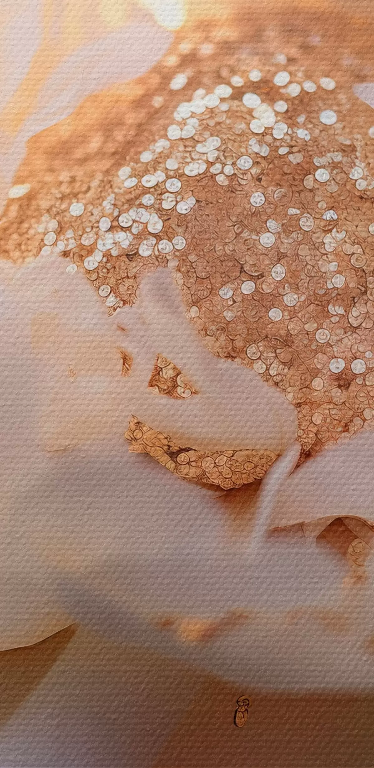 Das Bild kann vorsichtig mit einem trockenen, weichen Tuch oder Schwamm abgewischt werden; es wird nicht empfohlen, feuchte Produkte zu verwenden. Die Verwendung eines feuchten Schwamms ist nur zulässig, wenn das Bild lackiert wurde.