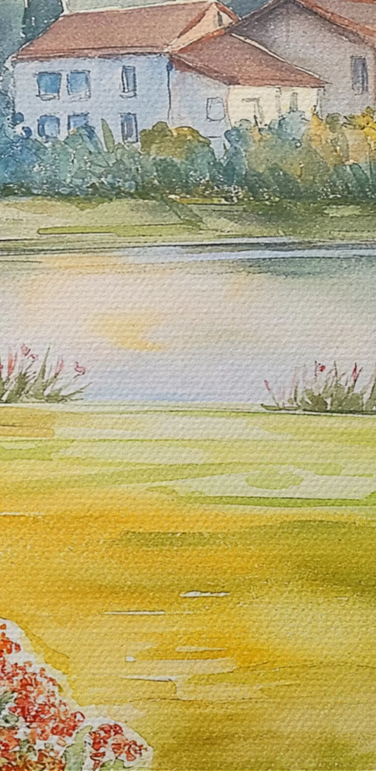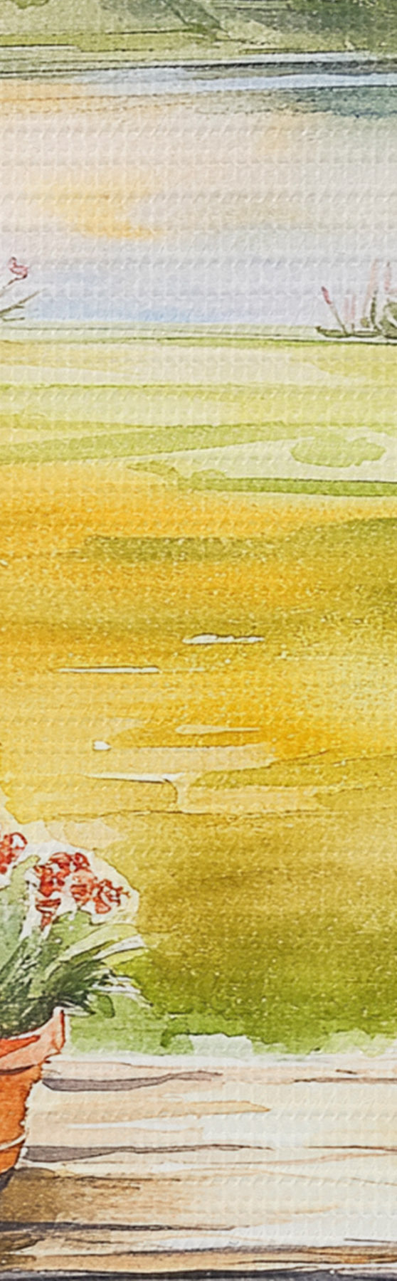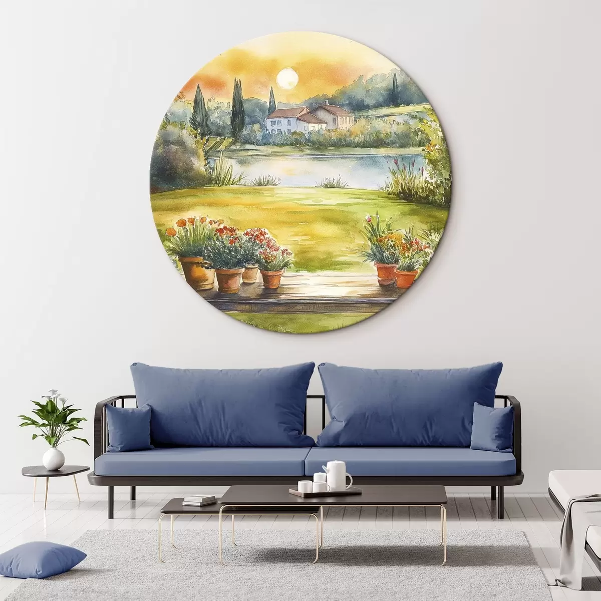 Runde Wandbilder Dorf im Sonnenuntergang, rustikal, Sommerblumen, See, Aquarellstil r44016