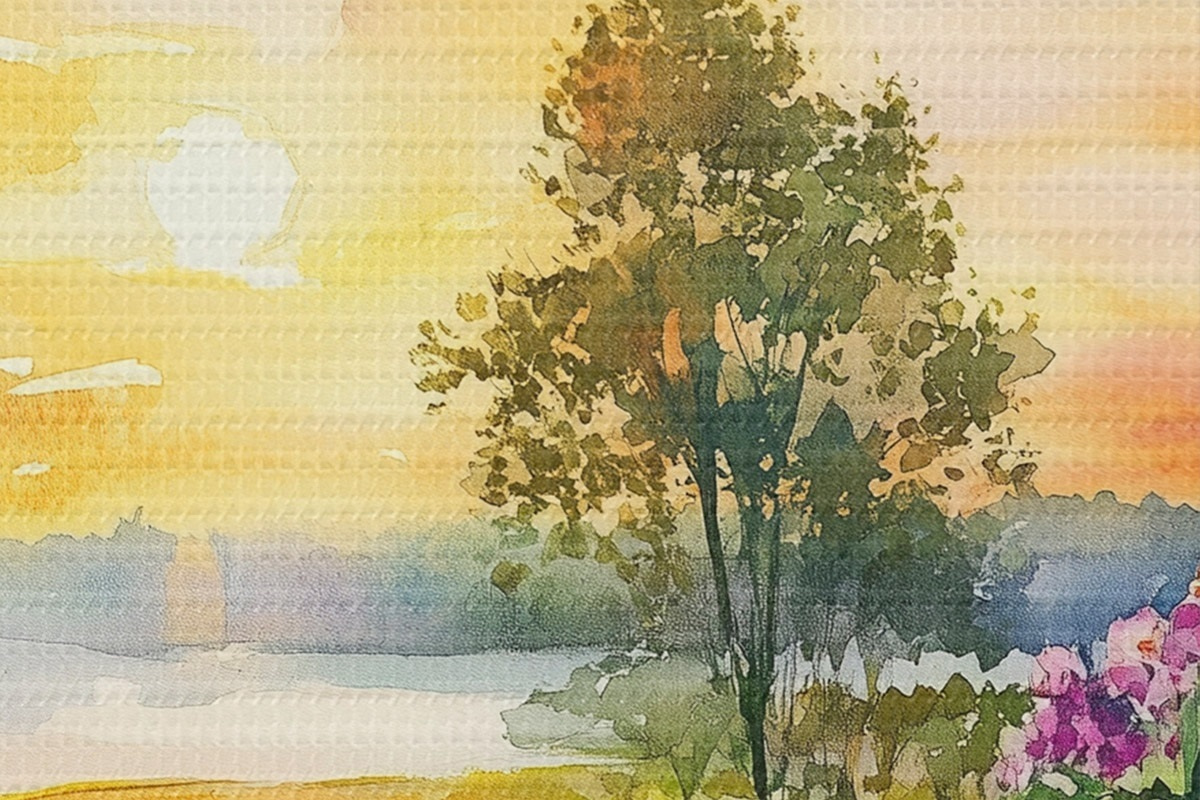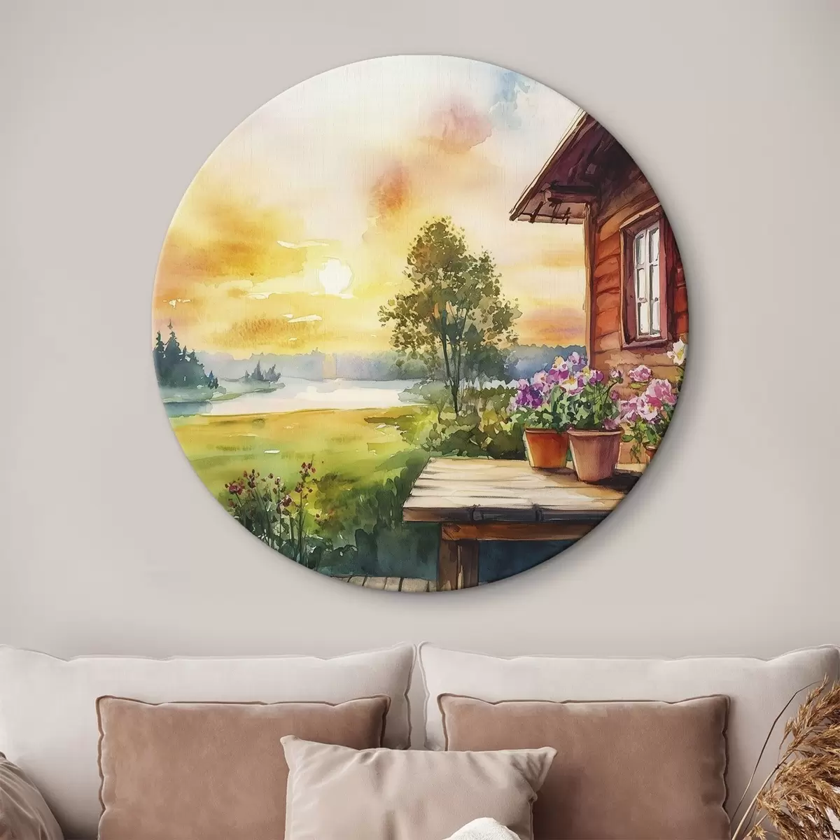Runde Wandbilder Farben des Sonnenuntergangs, Bauernhaus, Aquarellstil, rustikal, Sommerblumen r44017