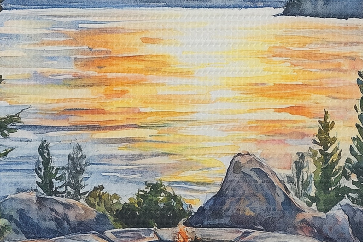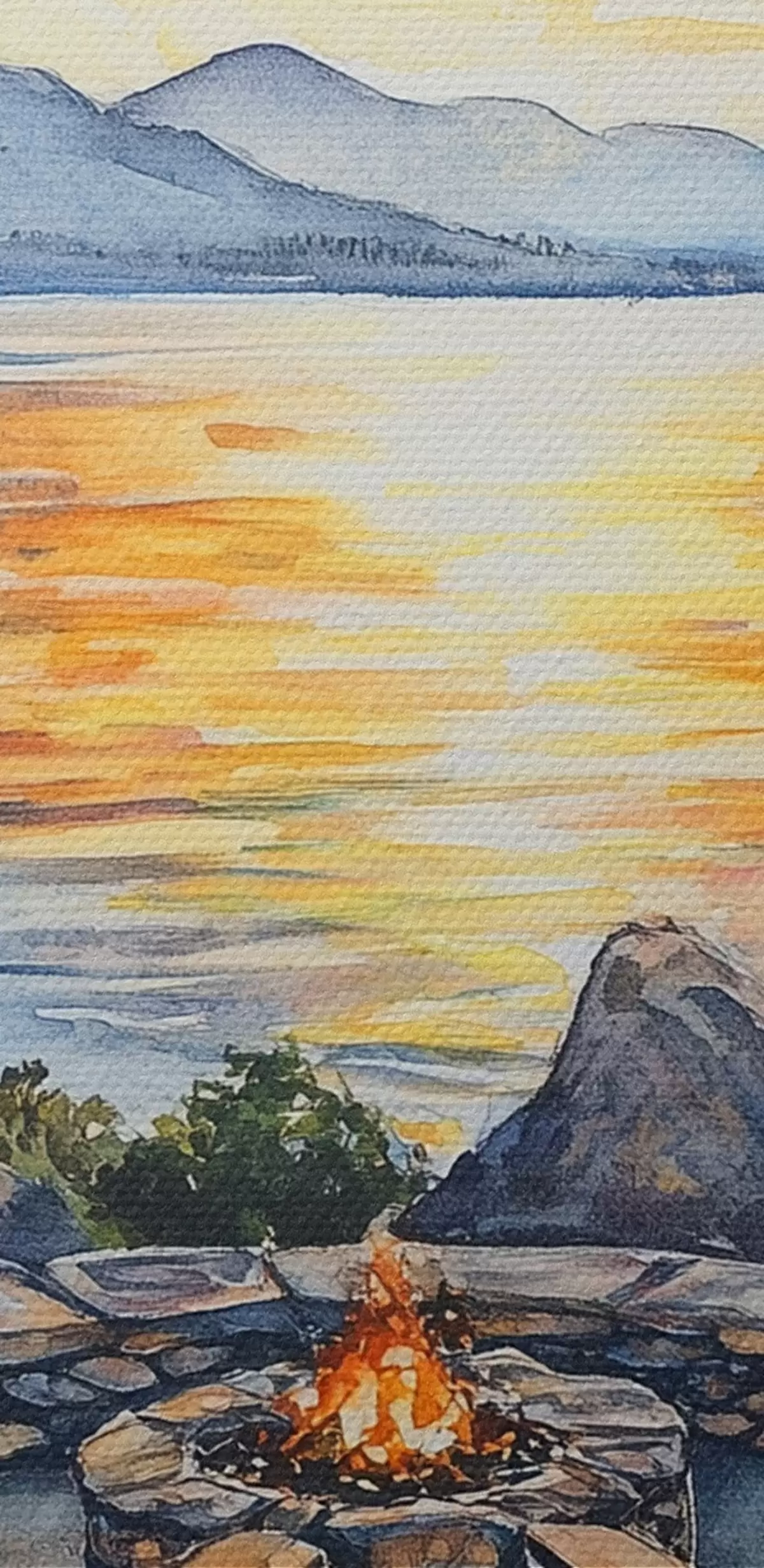 Runde Wandbilder See mit Bergen auf den Sonnenuntergang, Reisen, gemütlichen Kamin, Aquarell r44018