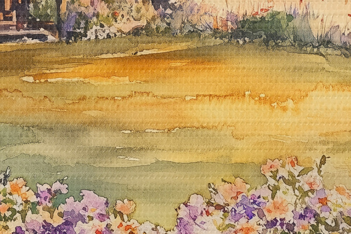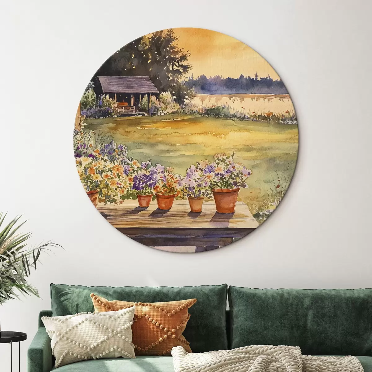Runde Wandbilder Blumen im Dorfgarten, Sonnenuntergang Farben, Aquarell-Stil r44019