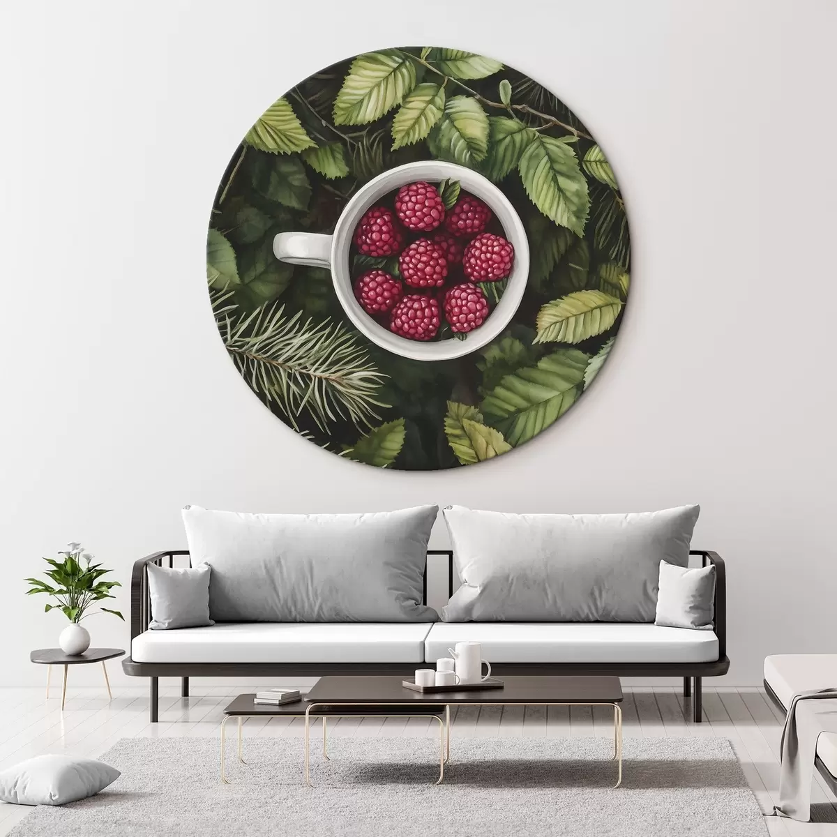Runde Wandbilder Schale mit Himbeeren im grünen Wald, Natur, Aquarellstil Nr r44021