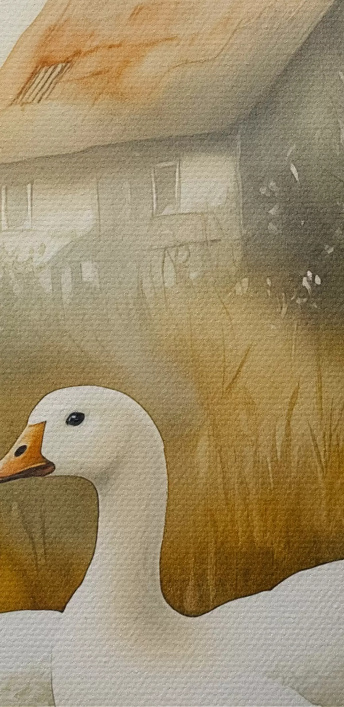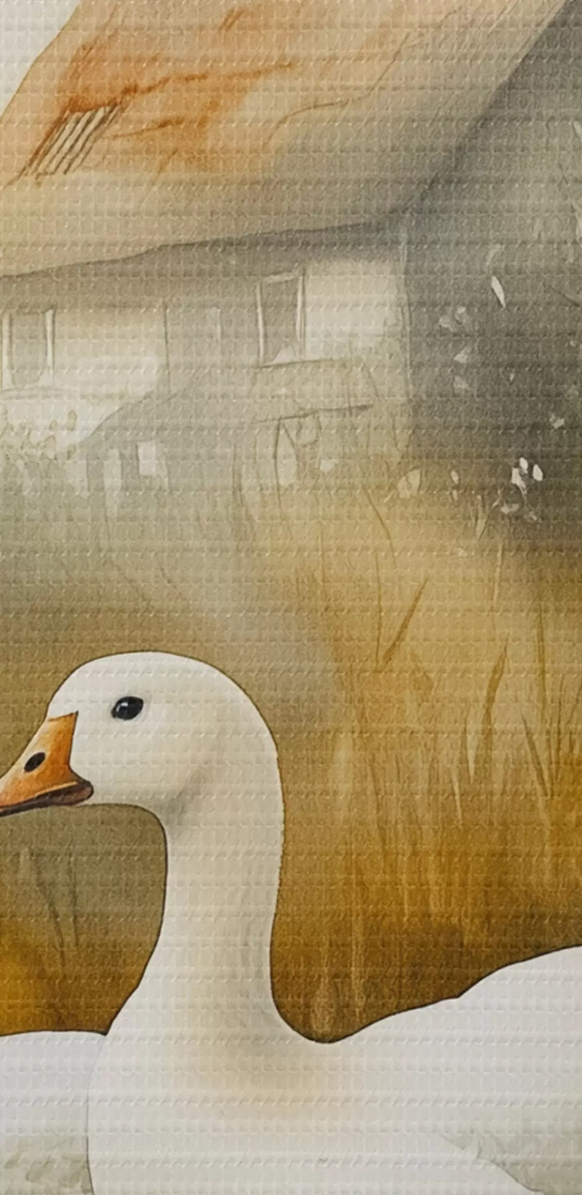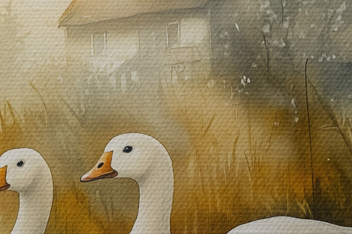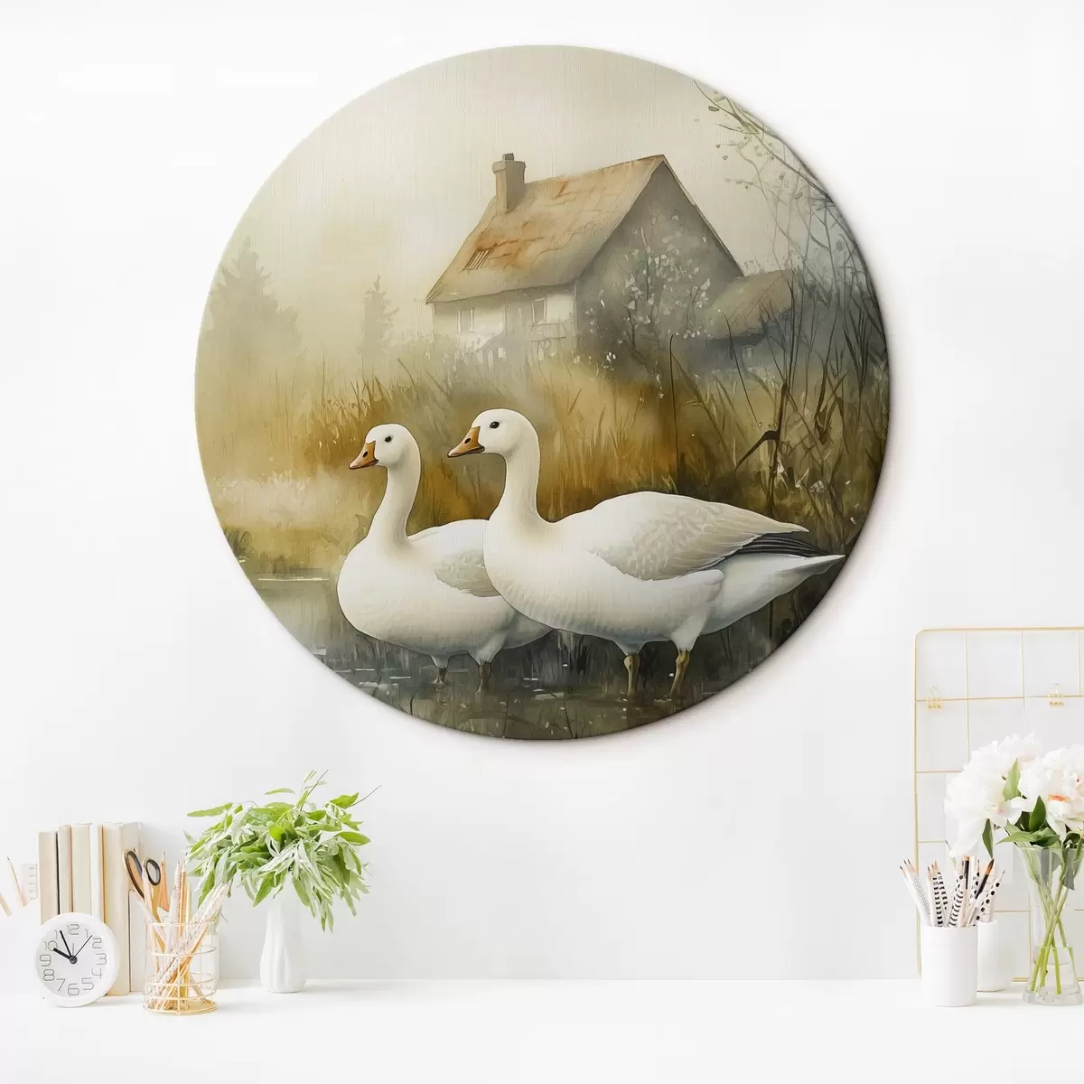 Runde Wandbilder Gänse im See in der Nähe des Bauernhauses, rustikal, Aquarell-Stil r44022