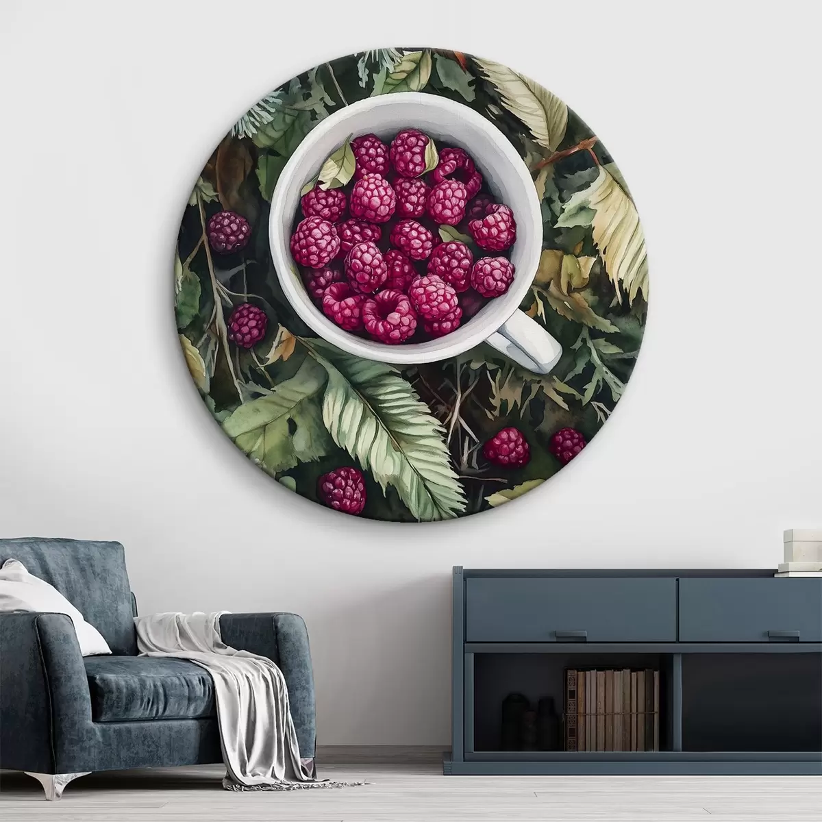 Runde Wandbilder Saftige Himbeeren im Wald, rustikal, Blätter, Aquarellstil r44023