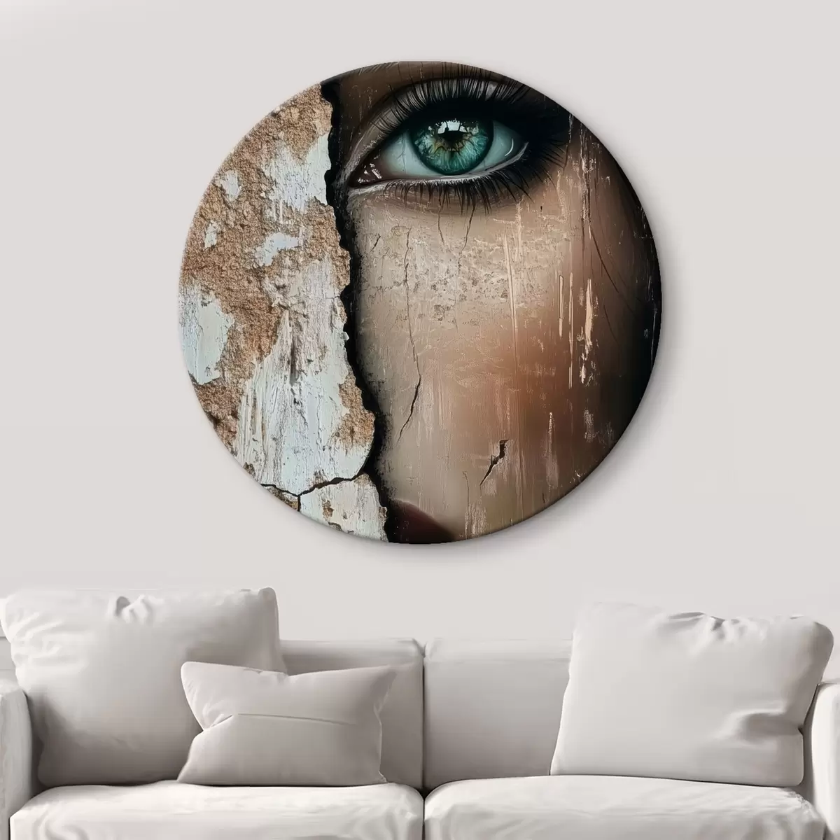 Runde Wandbilder Das Gesicht eines Mädchens hinter einer alten Mauer Nr r44069