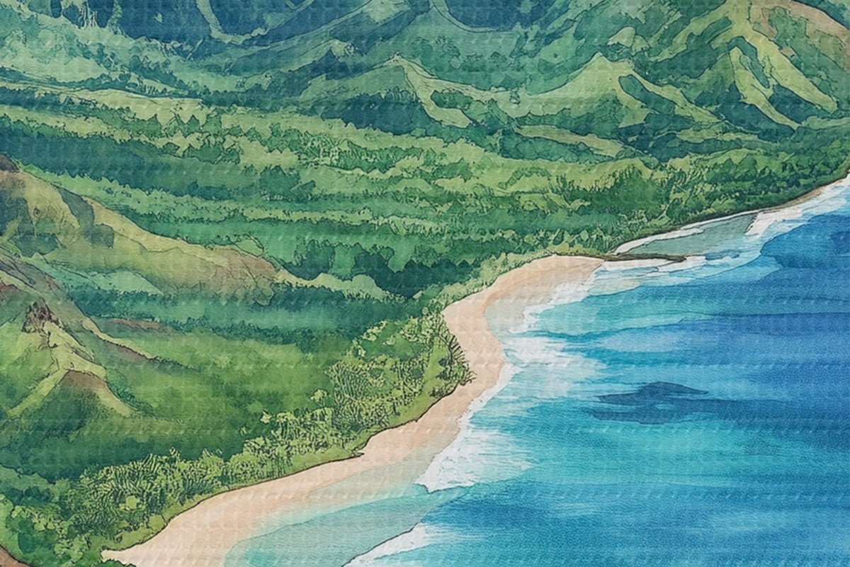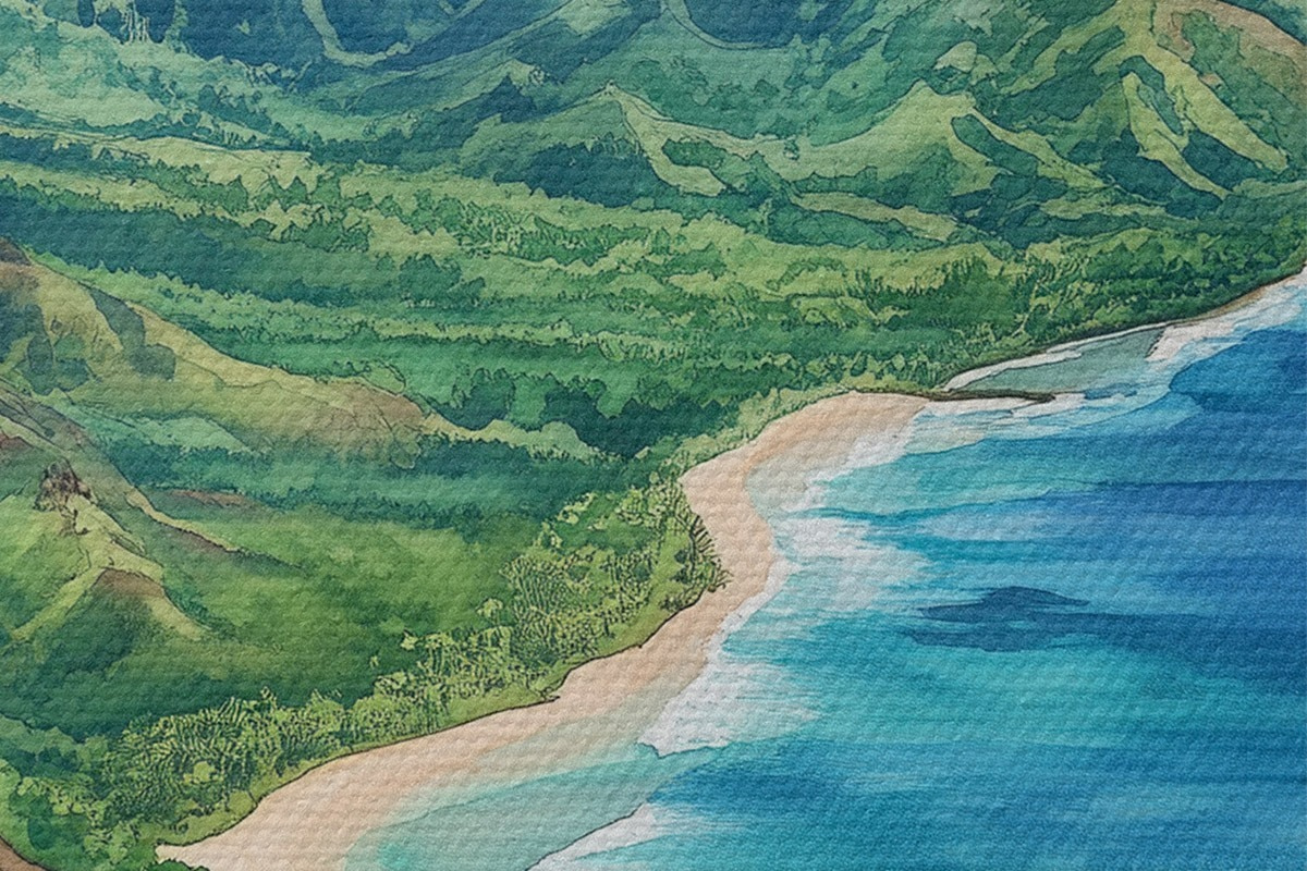 Runde Wandbilder Grüne Berge, Hawaii, Ozean, tropisch, Aquarellstil r44143
