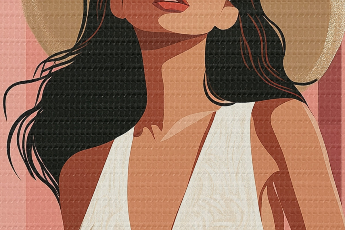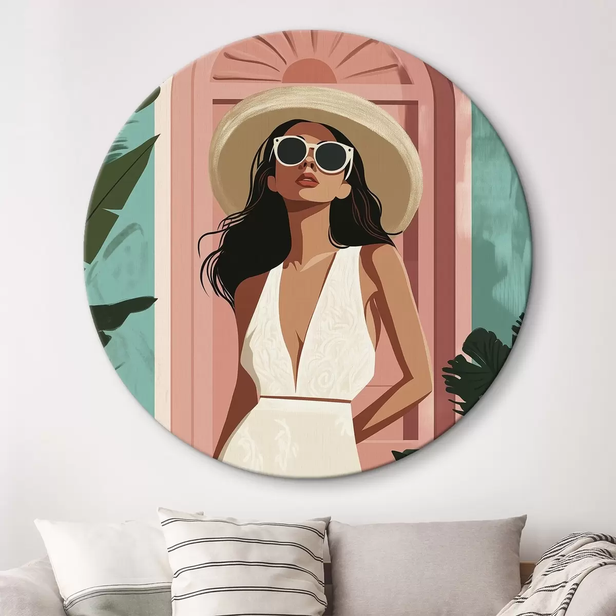 Runde Wandbilder Frau mit Sonnenbrille und Hut, tropische Natur, Architektur r44152