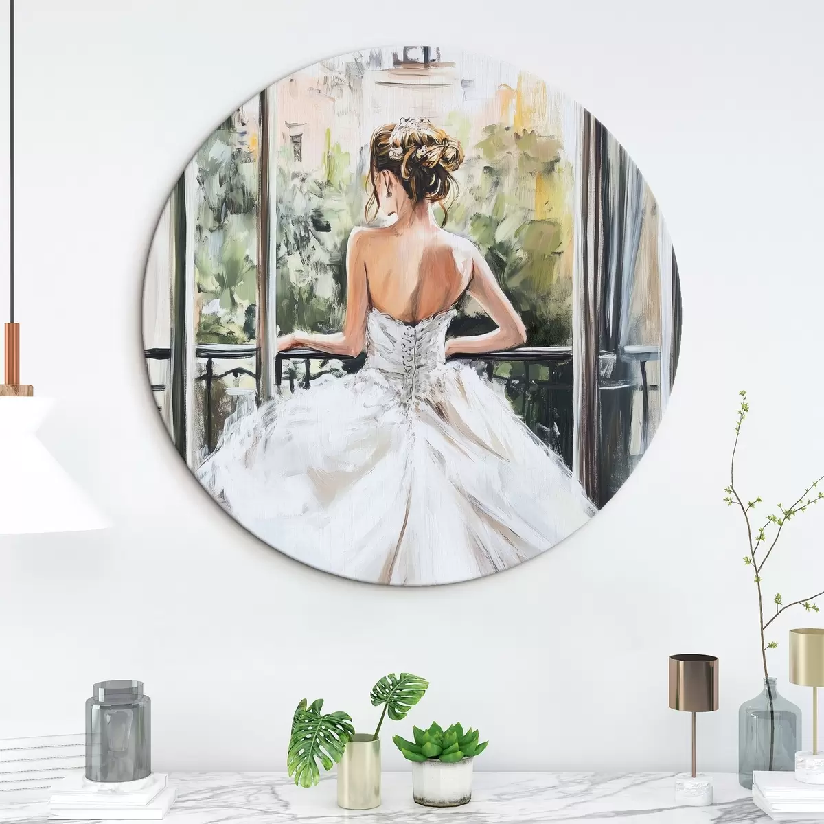 Runde Wandbilder Mädchen in einem weißen Kleid auf dem Balkon Nr r44226
