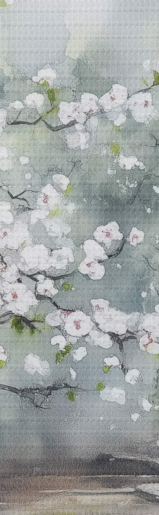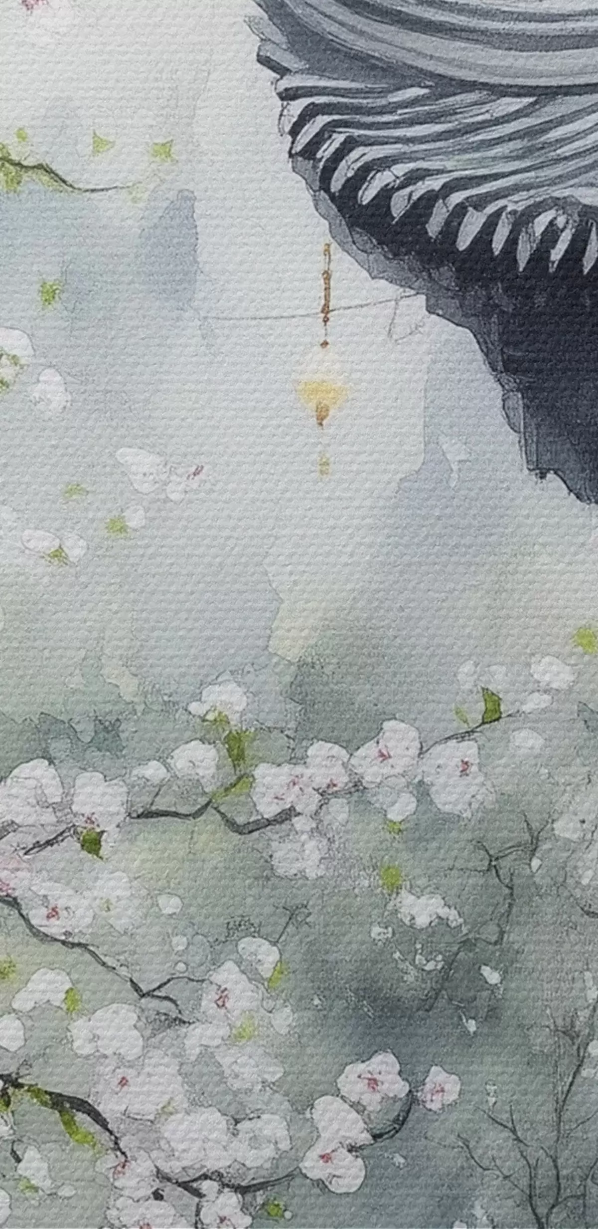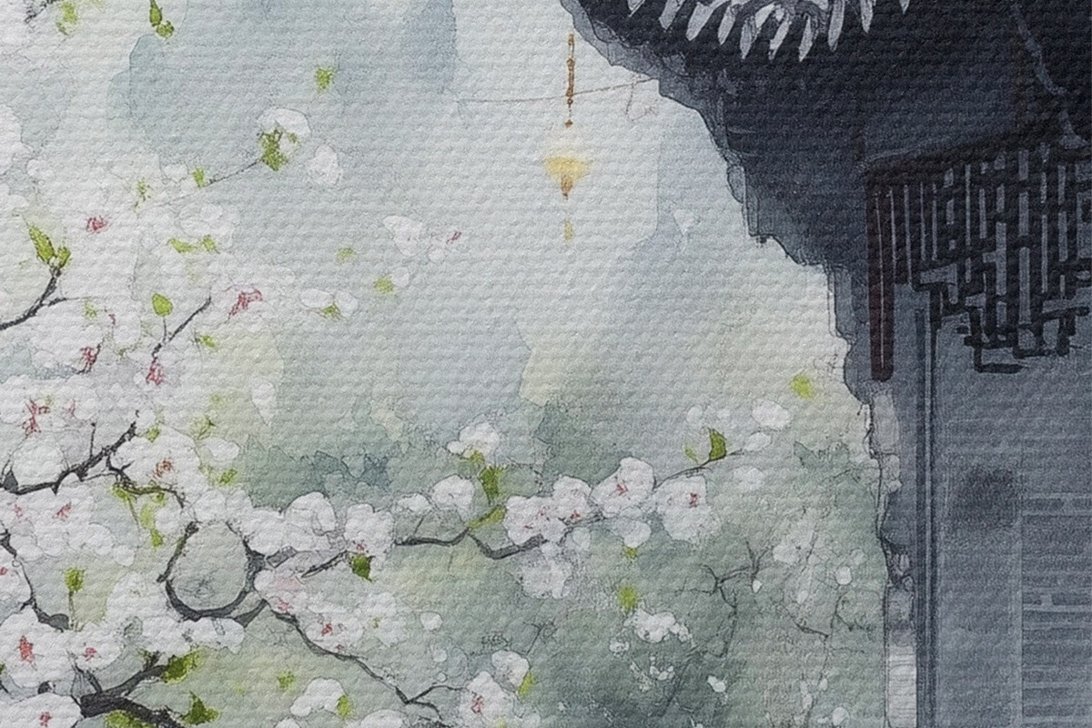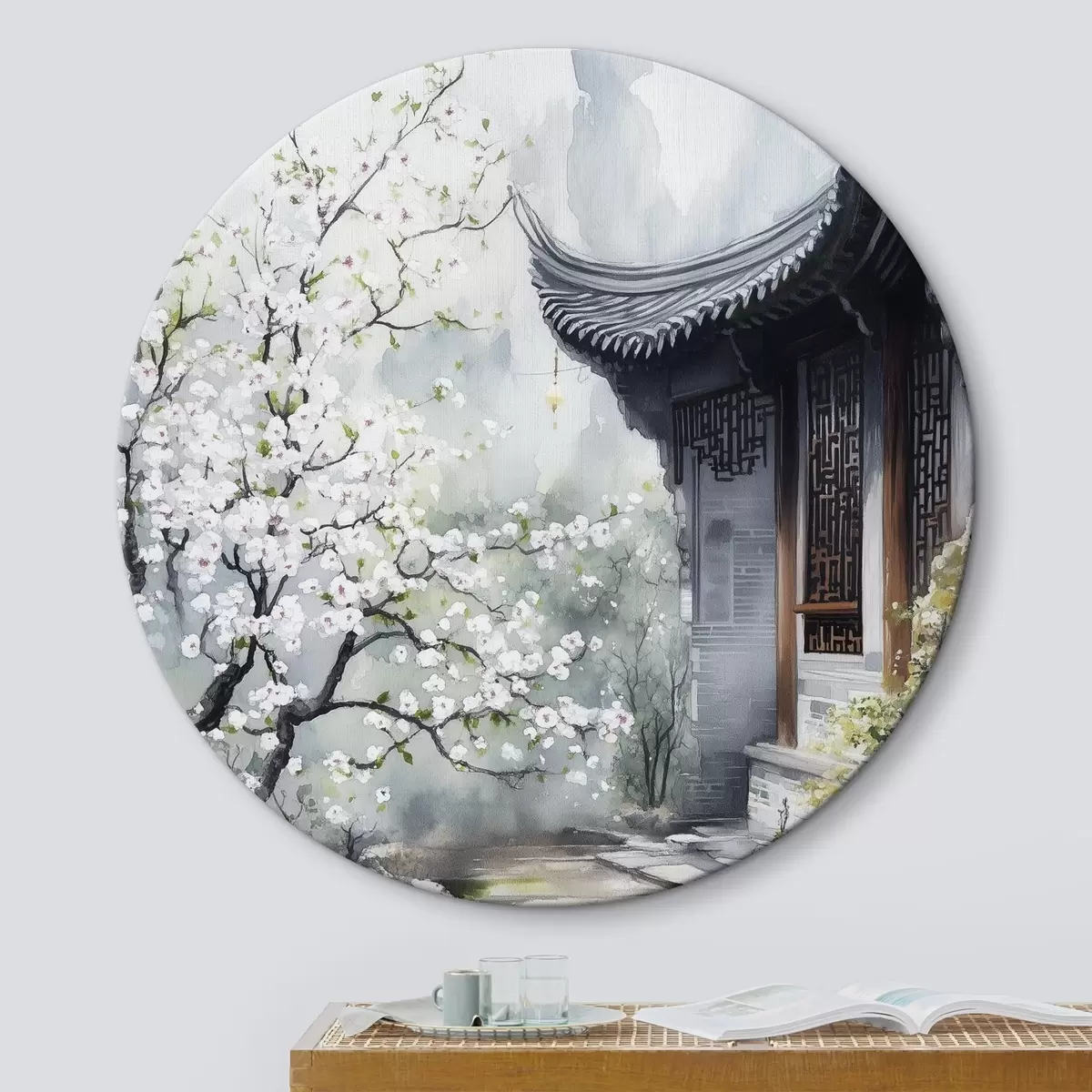 Runde Wandbilder Japanischer Garten mit Kirschbaum und Haus, orientalisch, Aquarellstil r44309