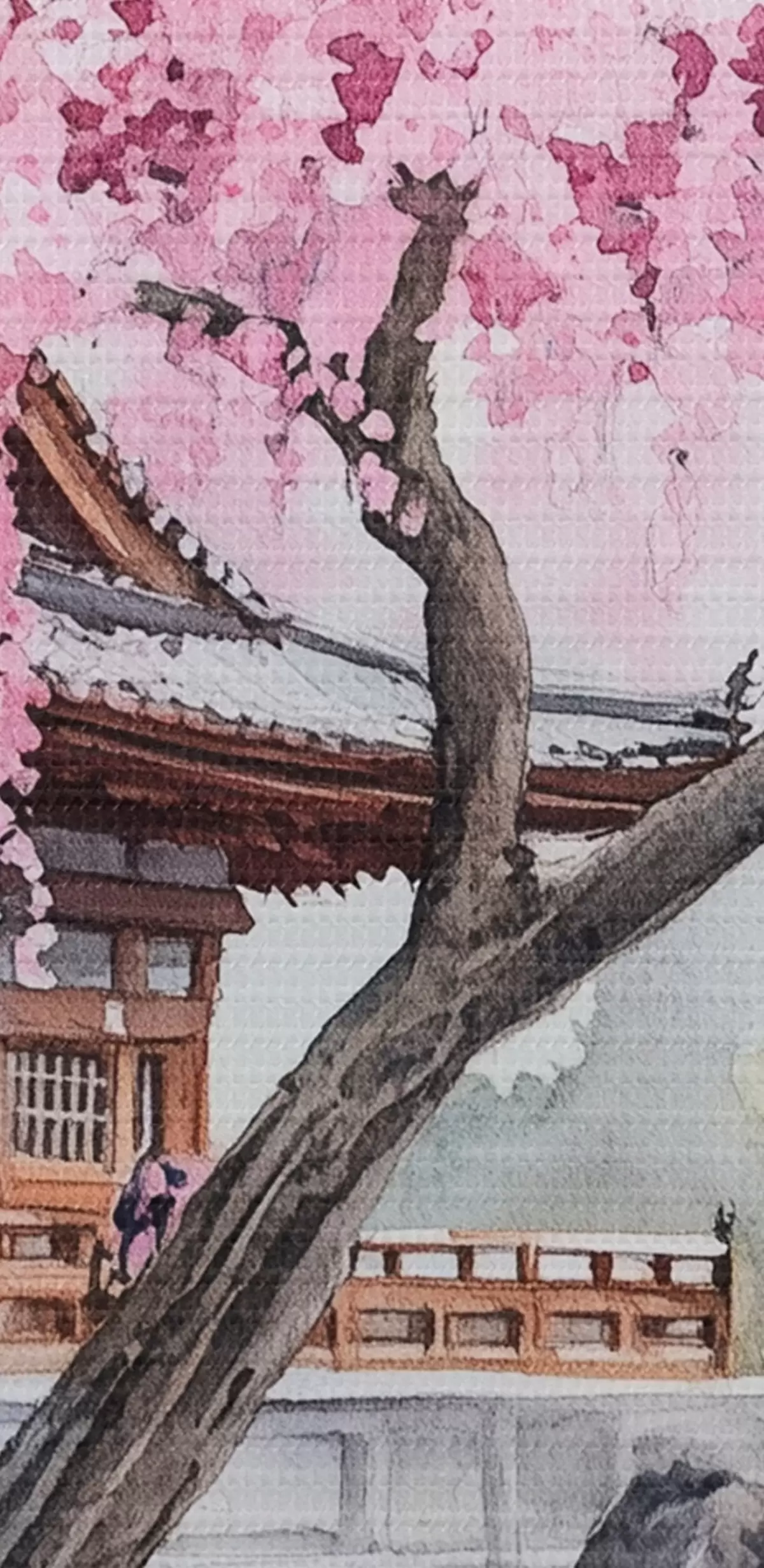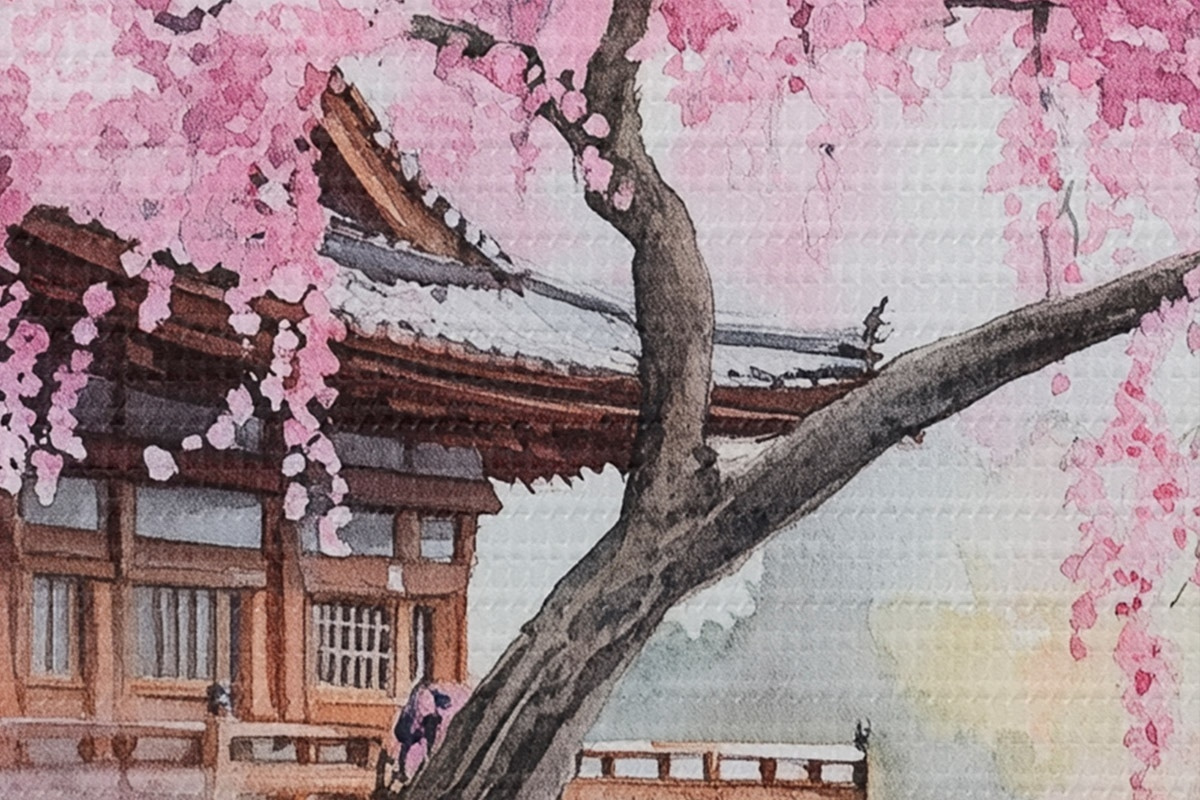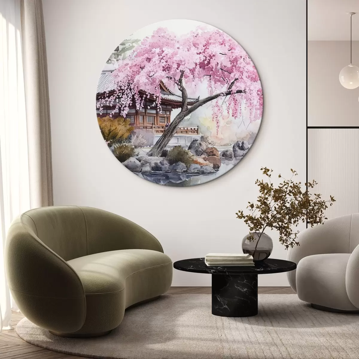 Runde Wandbilder Rosa Kirschbaum in der Nähe von Haus auf dem See, Japan, orientalisch, Aquarell-Stil r44312
