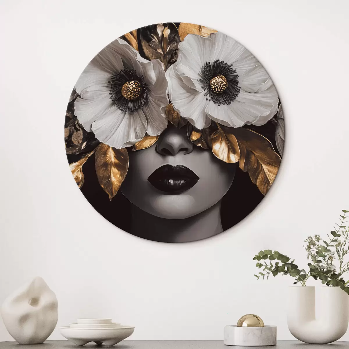 Runde Wandbilder Halbabstraktes Porträt einer Frau mit Blumen r44365