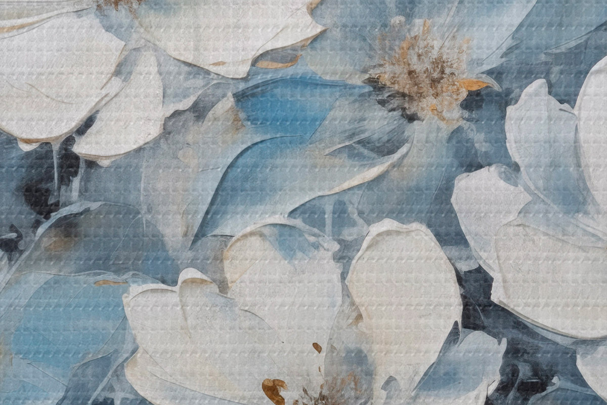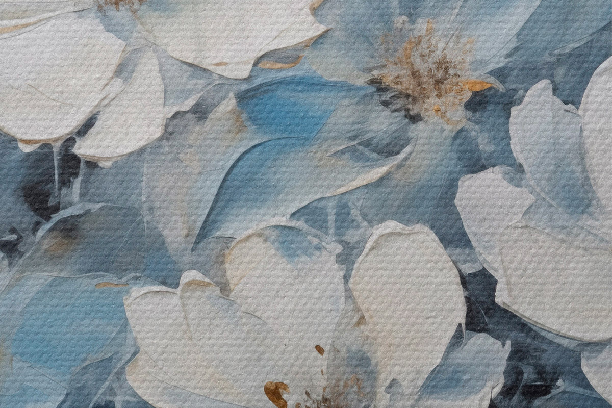 Runde Wandbilder Weiße Blumen mit blauen Blättern, auf einem hellbeigen Hintergrund, mit sichtbaren Pinselstrichen r44395