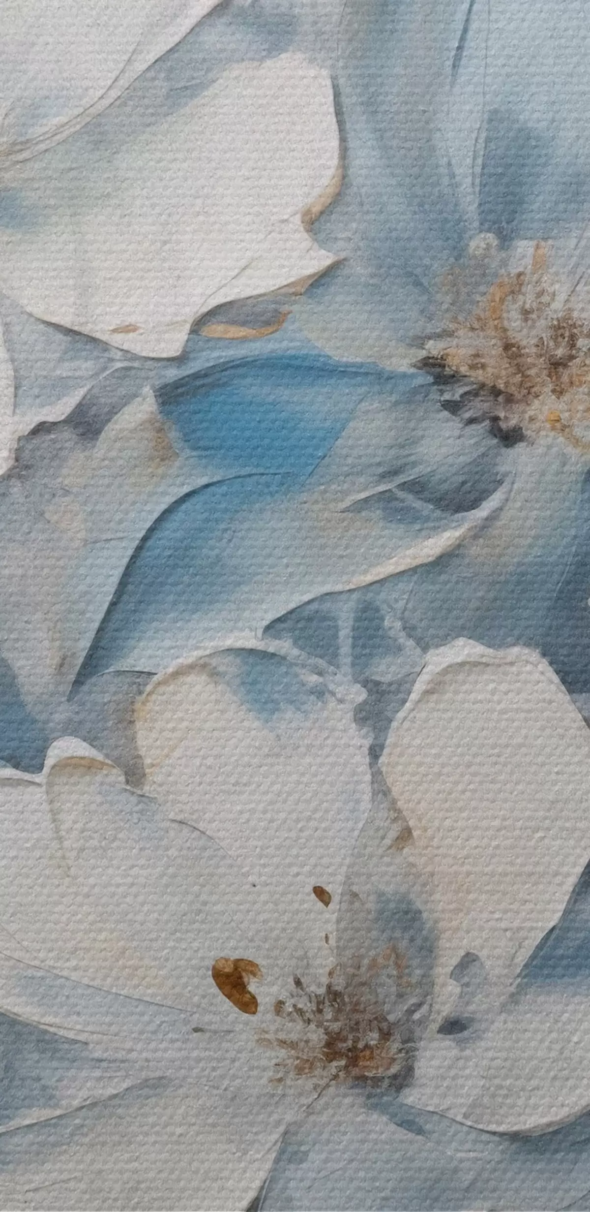 Runde Wandbilder Weiße Blumen mit blauen Blättern, auf einem hellbeigen Hintergrund, mit sichtbaren Pinselstrichen r44395