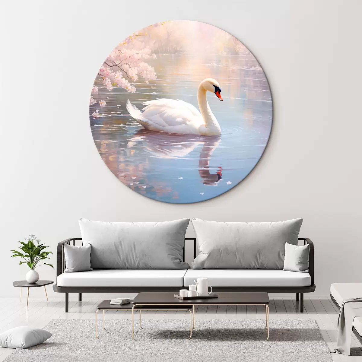 Runde Wandbilder Ein weißer Schwan schwimmt in einem See mit Kirschblütenbäumen, Pastellfarben r44396