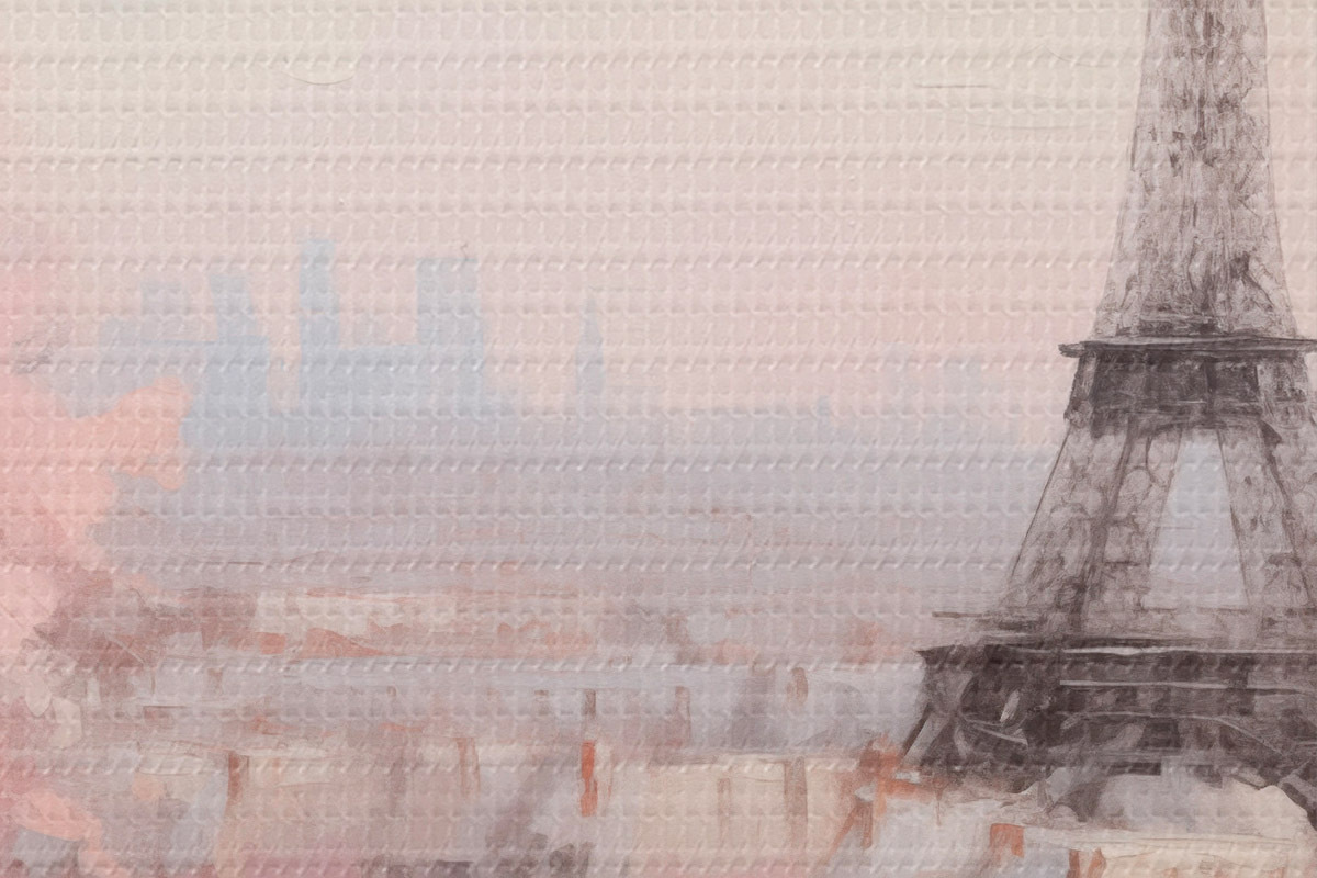 Runde Wandbilder Eiffelturm in Paris mit Kirschblütenbäumen im Frühling, sanfte Pastellfarben r44398