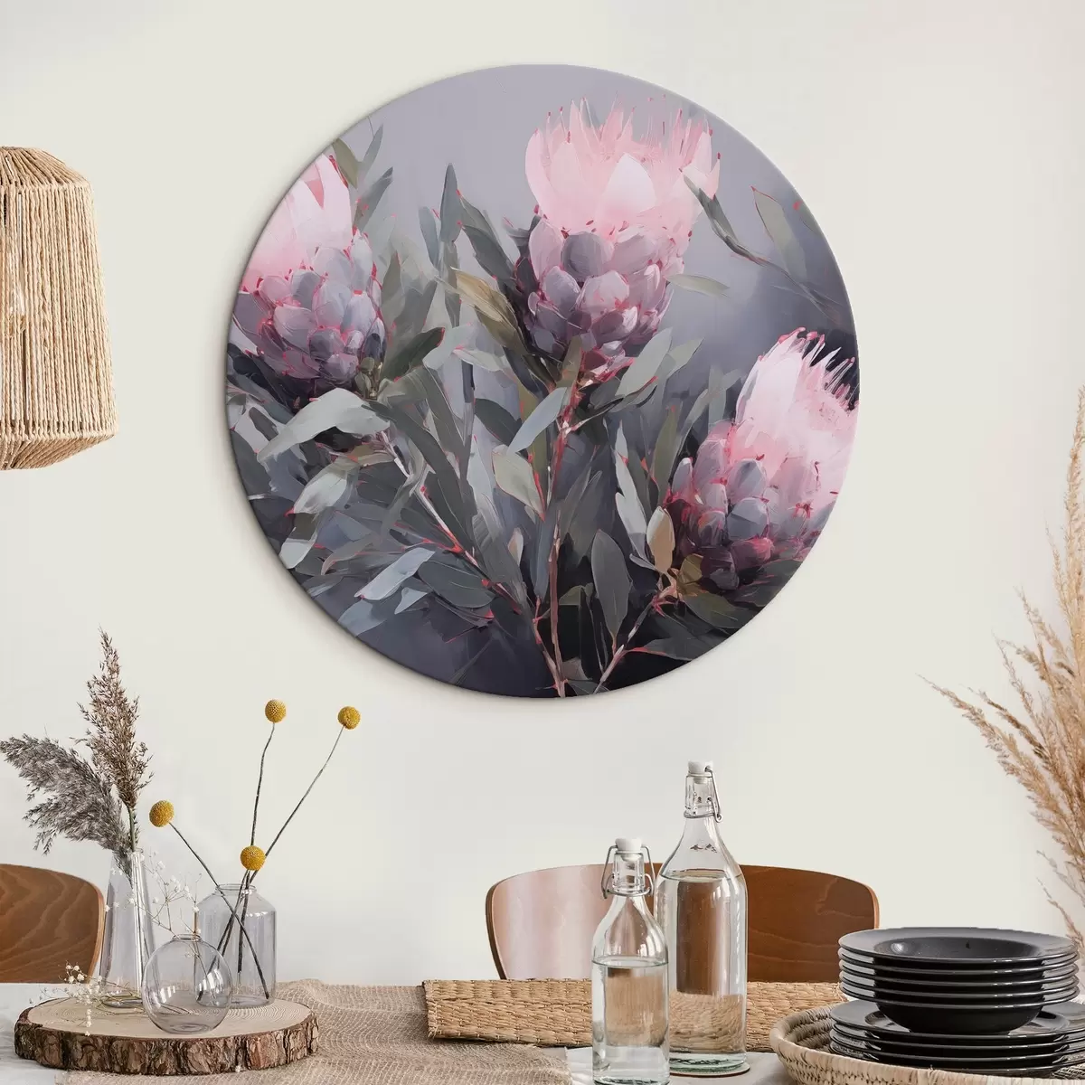 Runde Wandbilder Rosa Protea Blumen mit grünen Blättern, weiche Pinselstriche, dunkle Farben, elegante Komposition Nr r44400