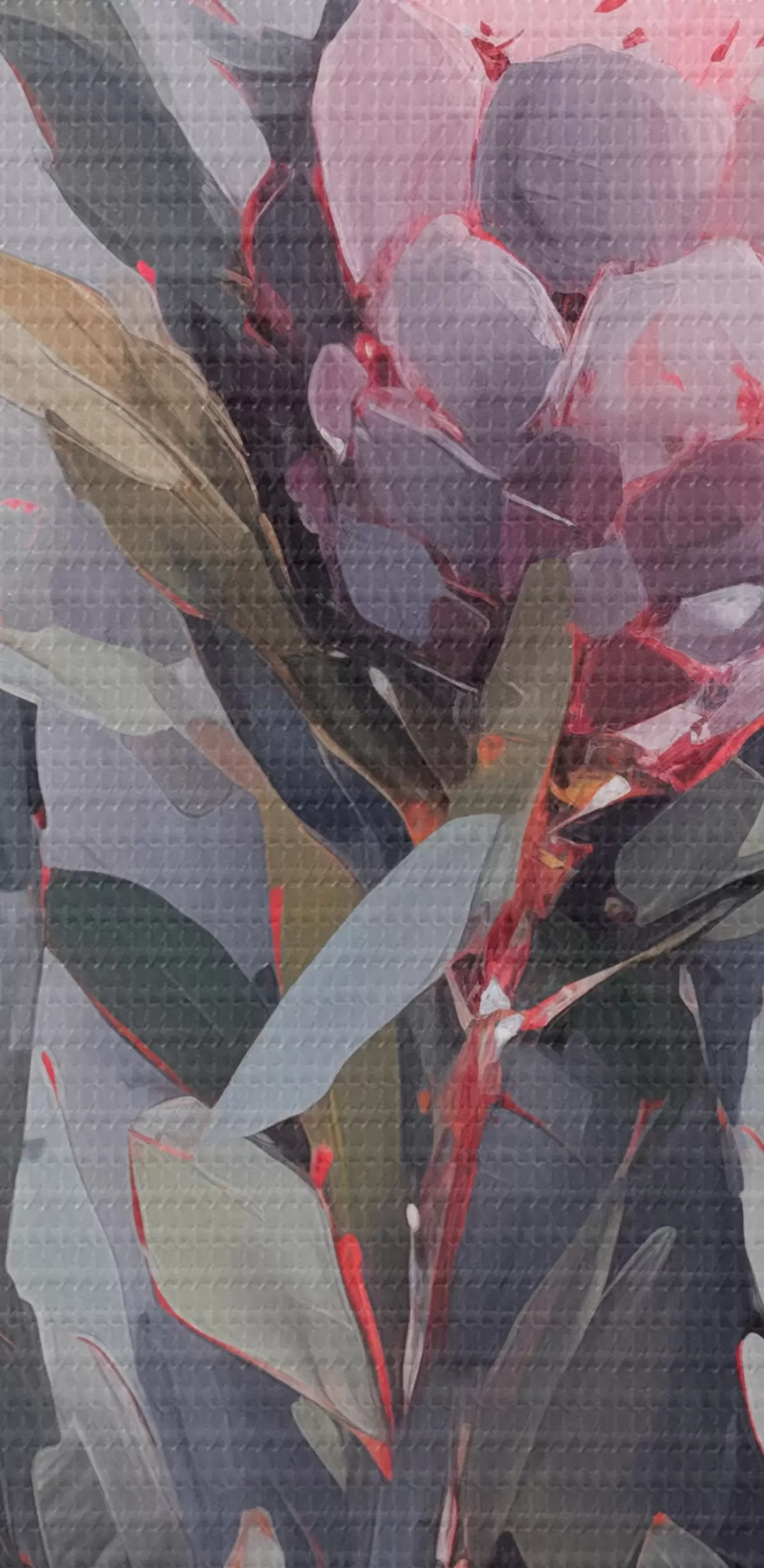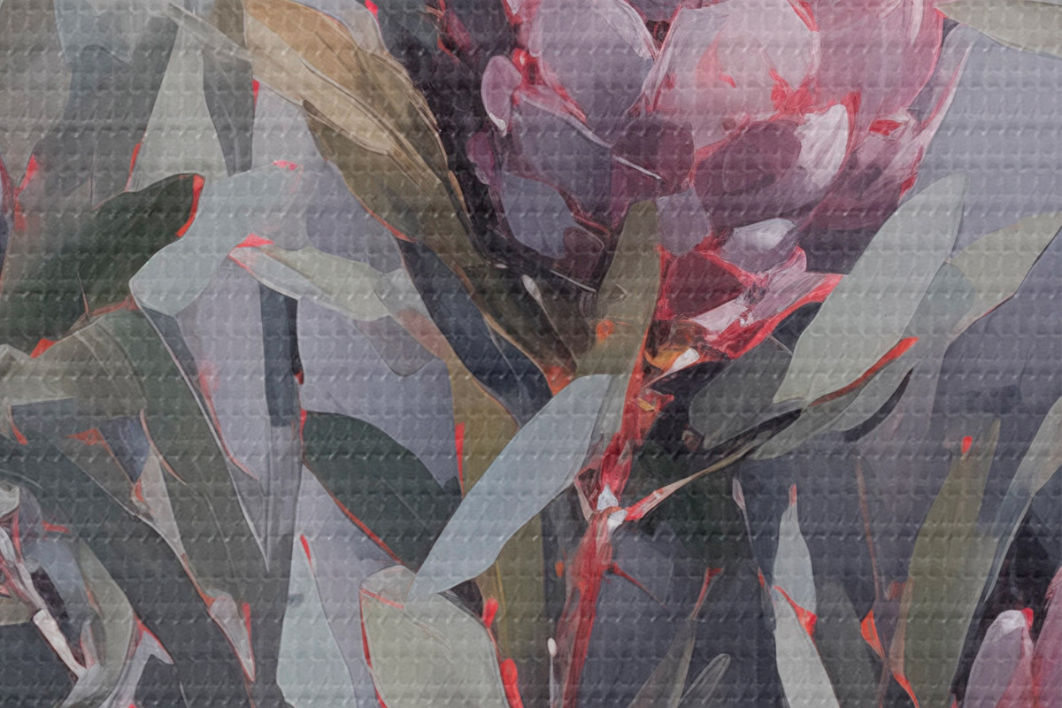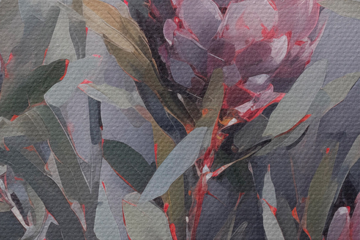 Runde Wandbilder Rosa Protea Blumen mit grünen Blättern, weiche Pinselstriche, dunkle Farben, elegante Komposition r44400