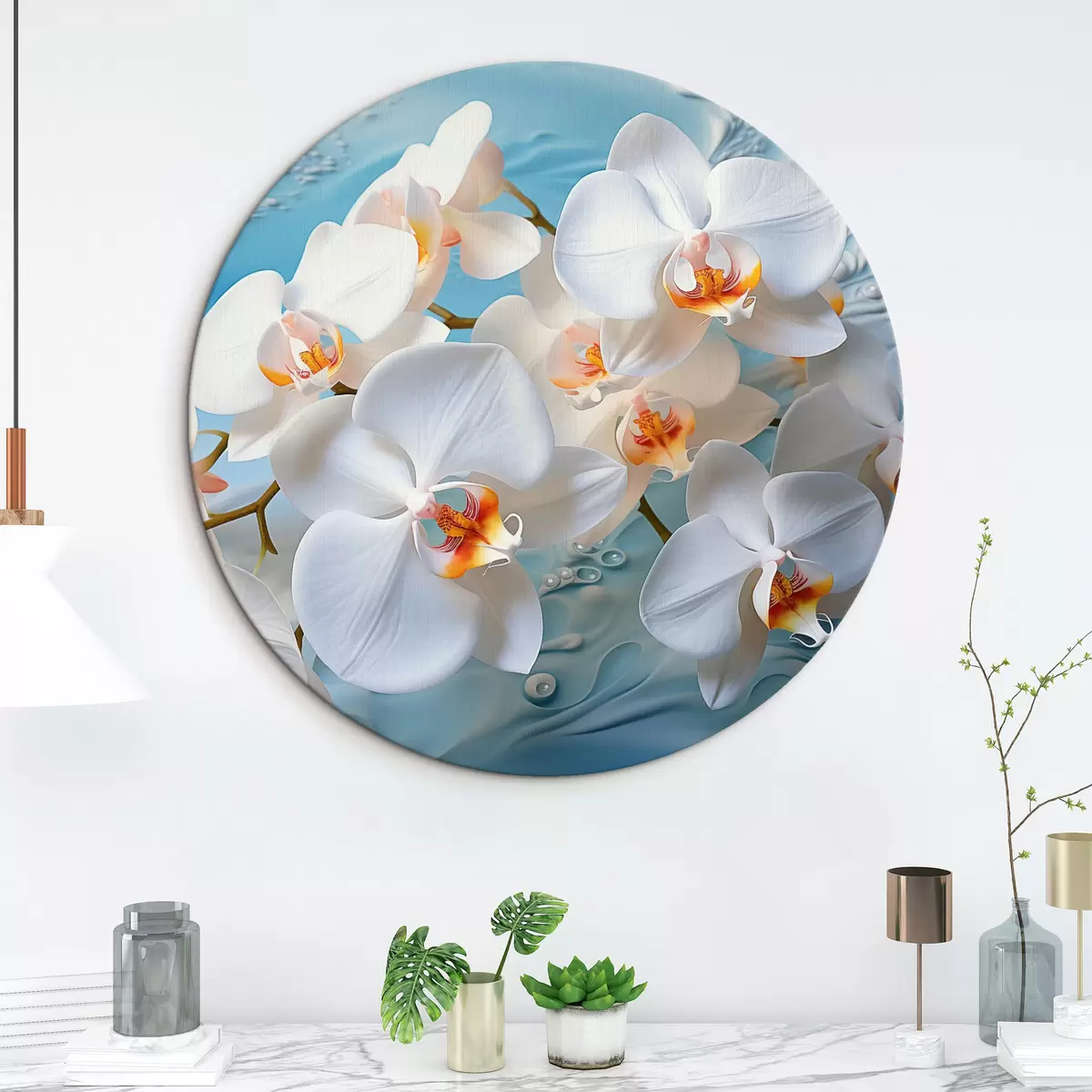 Runde Wandbilder Weiße Orchideen, angeordnet auf einer hellblauen Fläche mit Wassertropfen, sanfte Beleuchtung r44401