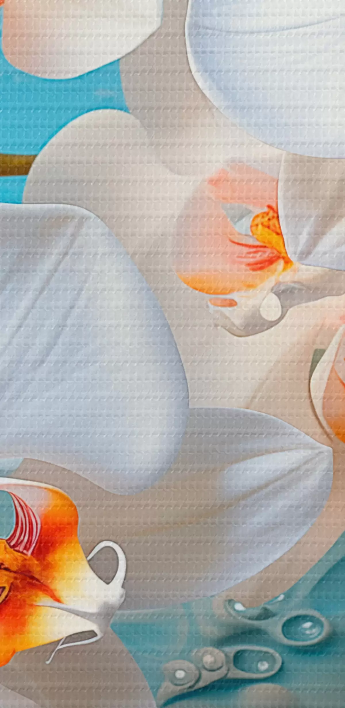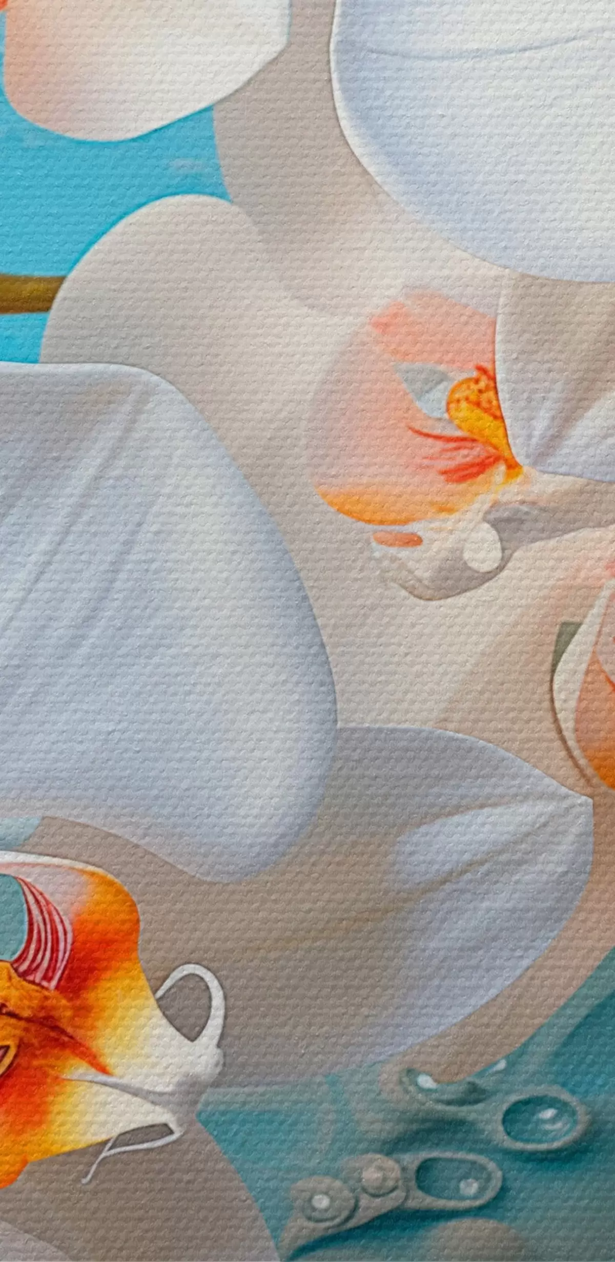 Runde Wandbilder Weiße Orchideen, angeordnet auf einer hellblauen Fläche mit Wassertropfen, sanfte Beleuchtung Nr r44401