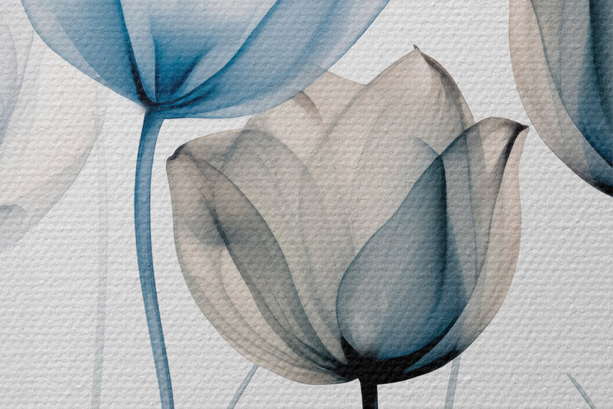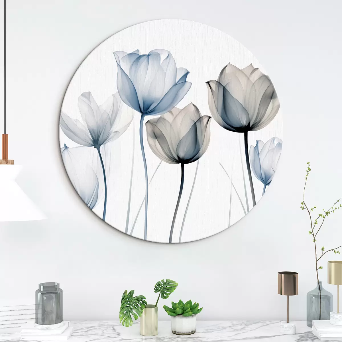 Runde Wandbilder Transluzente blaue und weiße Tulpen mit langen Stielen, vor einem schlichten weißen Hintergrund Nr r44409