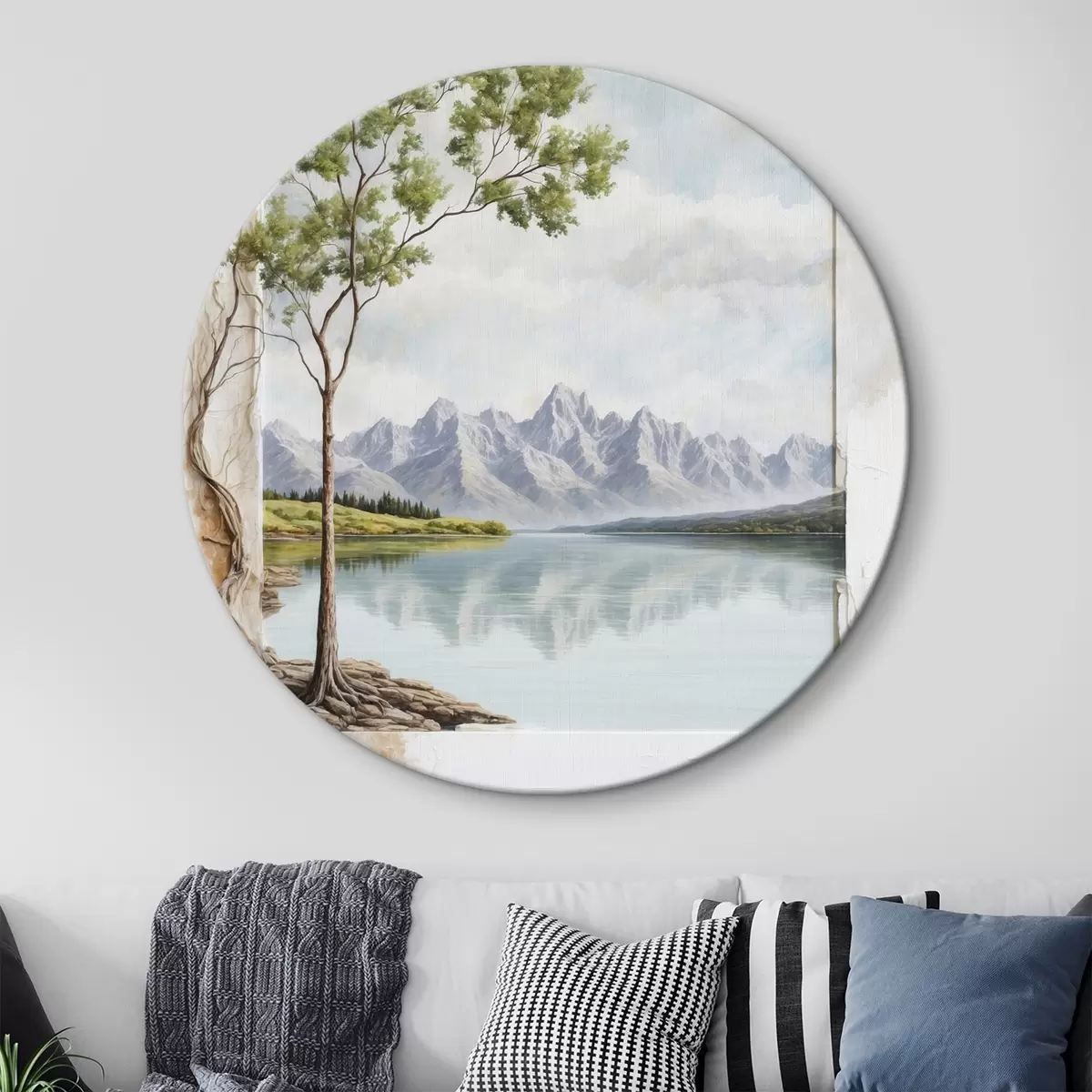 Runde Wandbilder Blick auf den See und verschneite Berge im Rahmen r44458