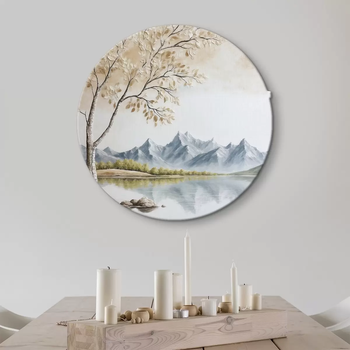 Runde Wandbilder Baum auf See und verschneite Berge im Hintergrund Nr r44459
