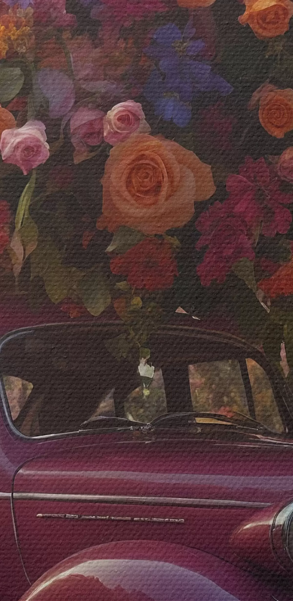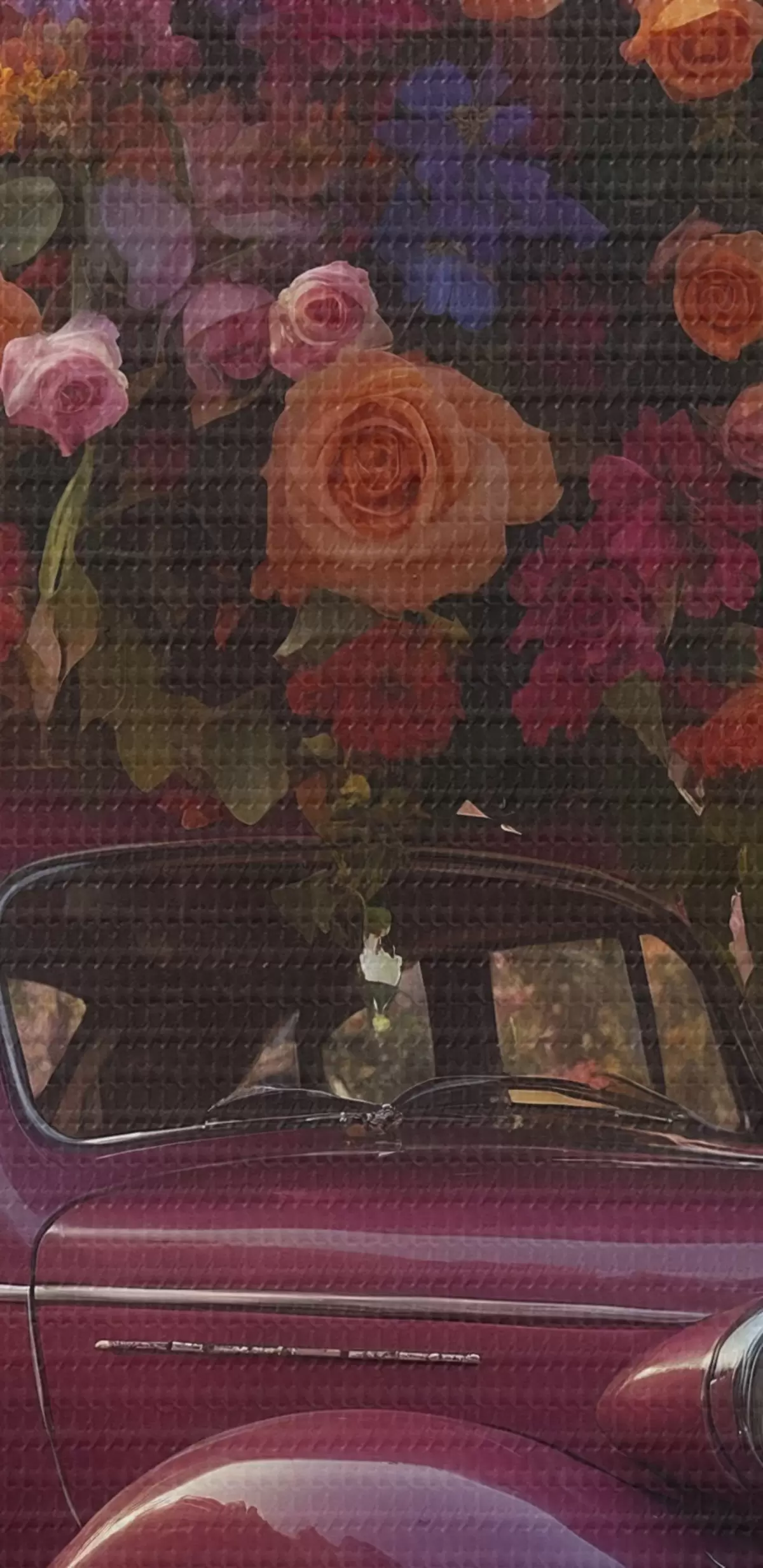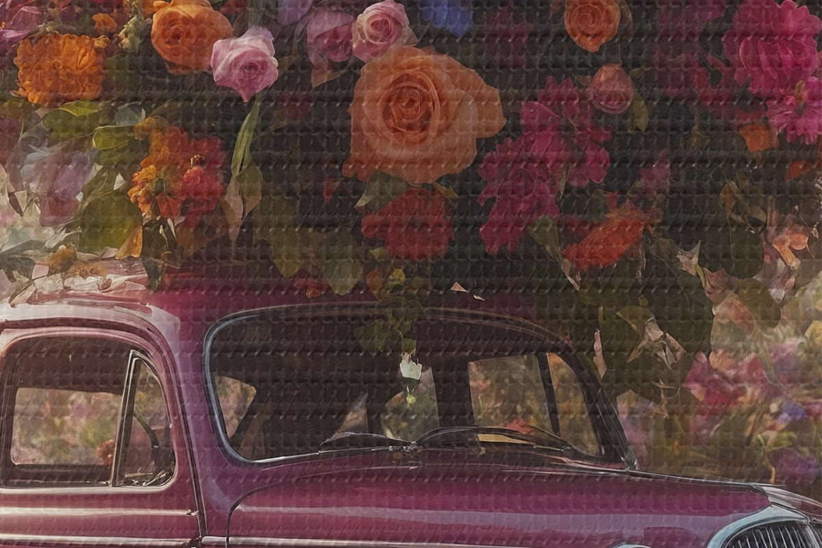 Runde Wandbilder Retro-Auto und ein riesiger Blumenstrauß r44471