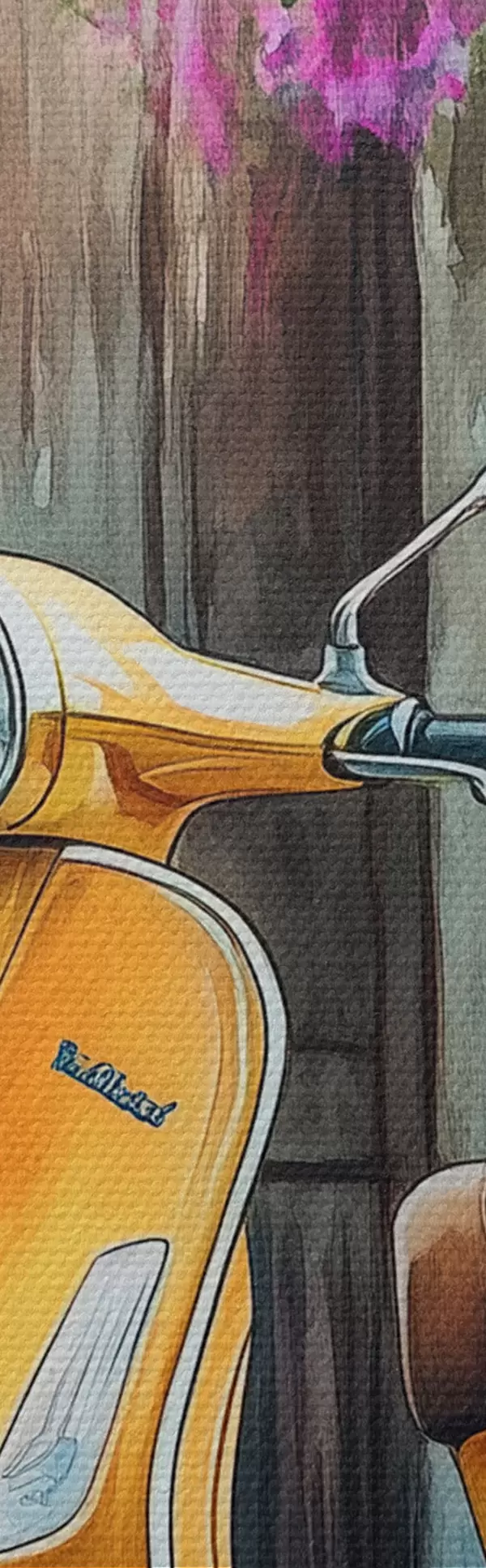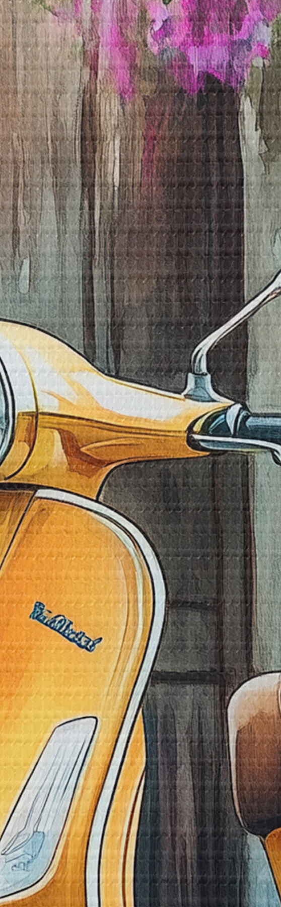 Runde Wandbilder Gelber Vespa-Roller in der Nähe der Holztür mit Blumen r44607