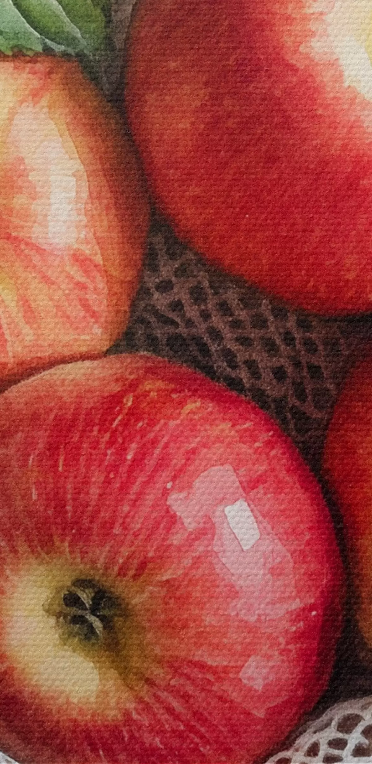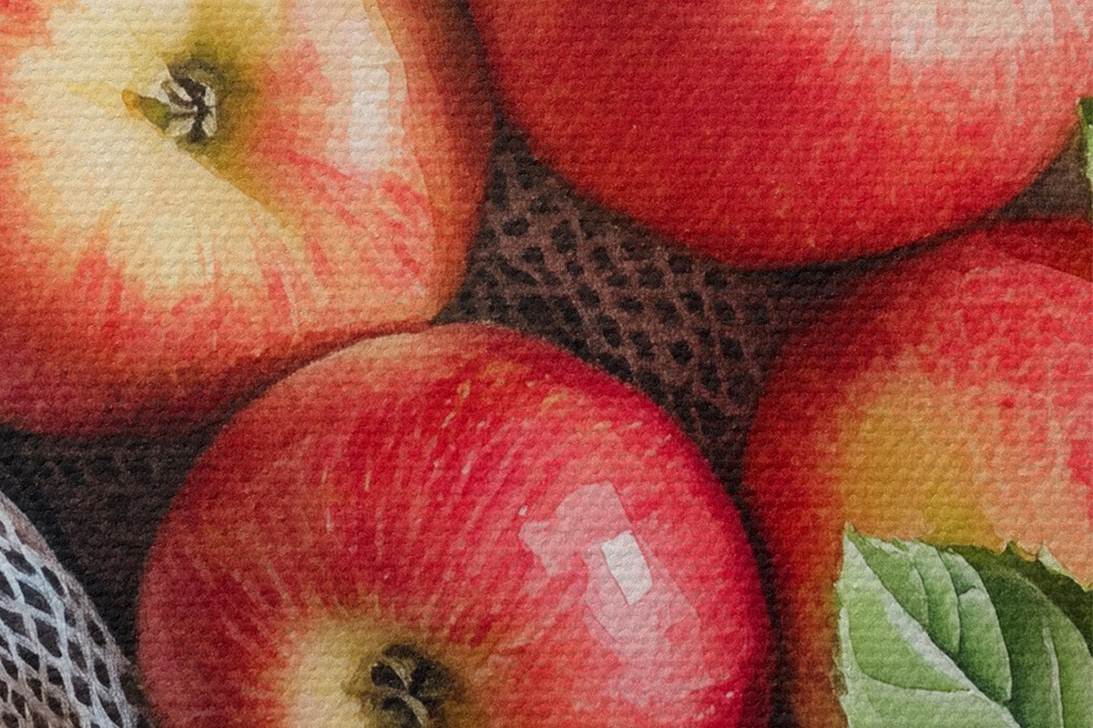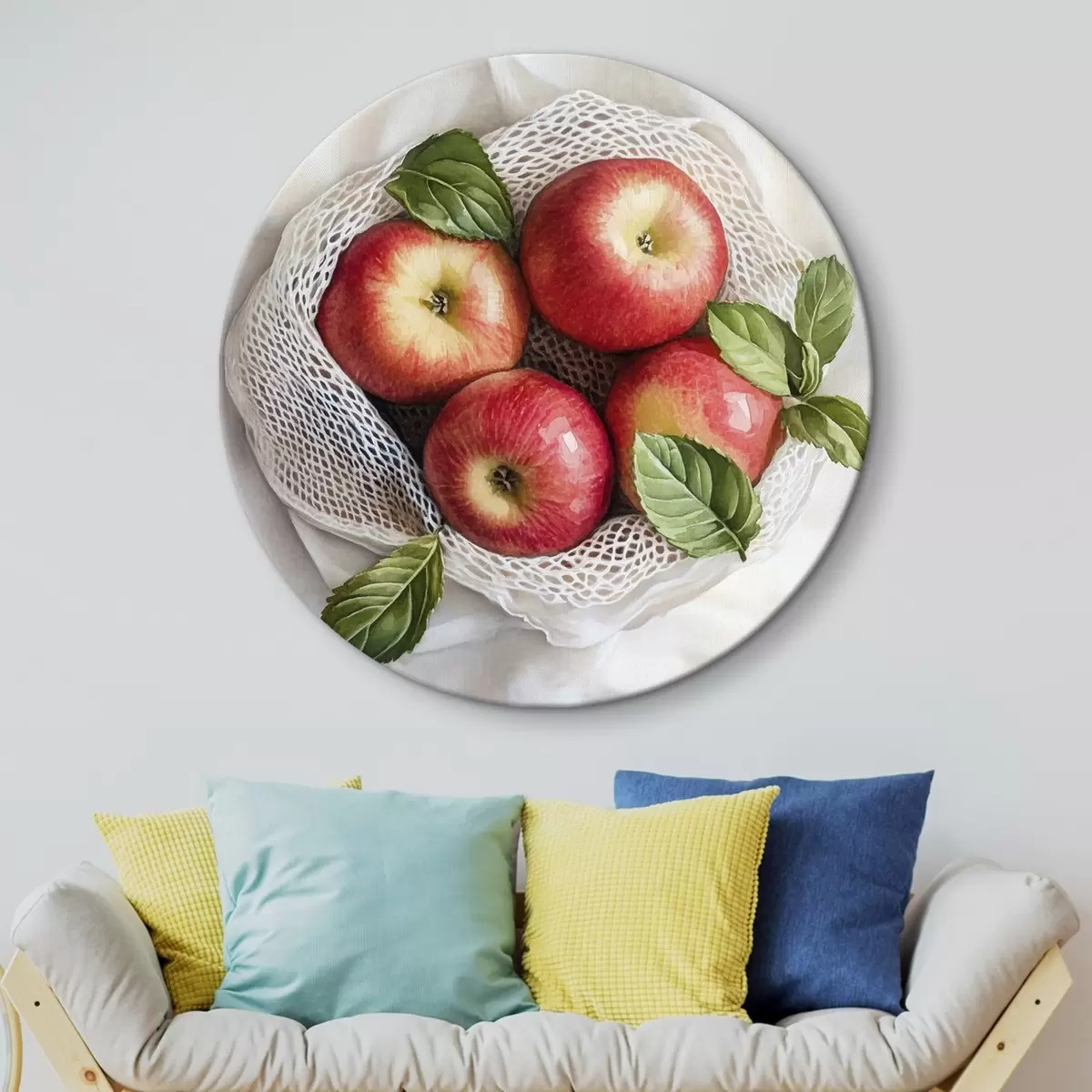 Runde Wandbilder Rote Äpfel in der Leinentasche mit Minzblättern, rustikaler Stil, Früchte r44609