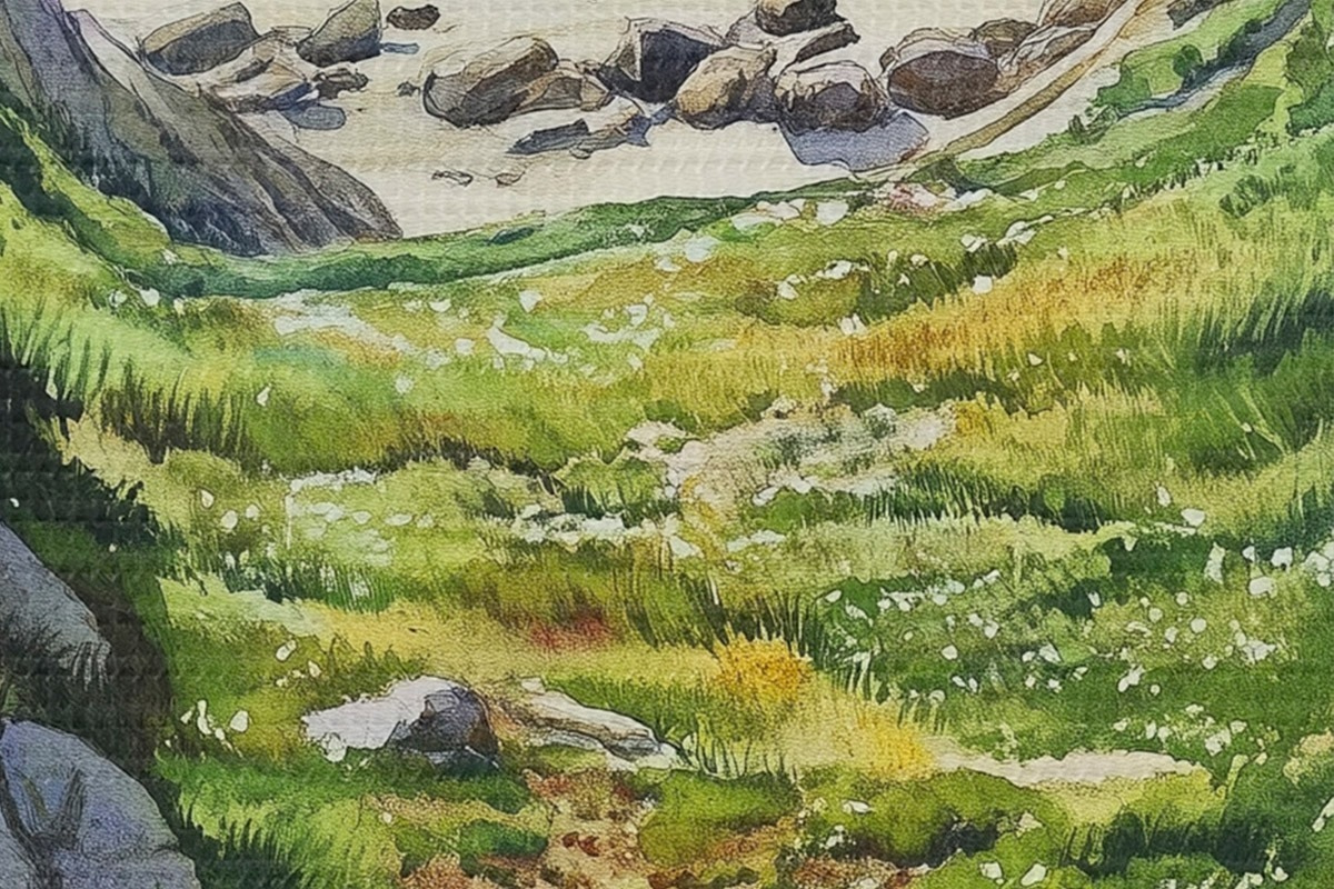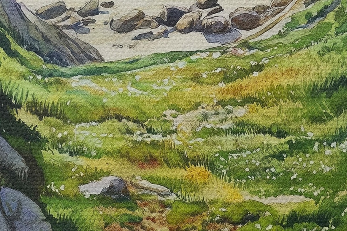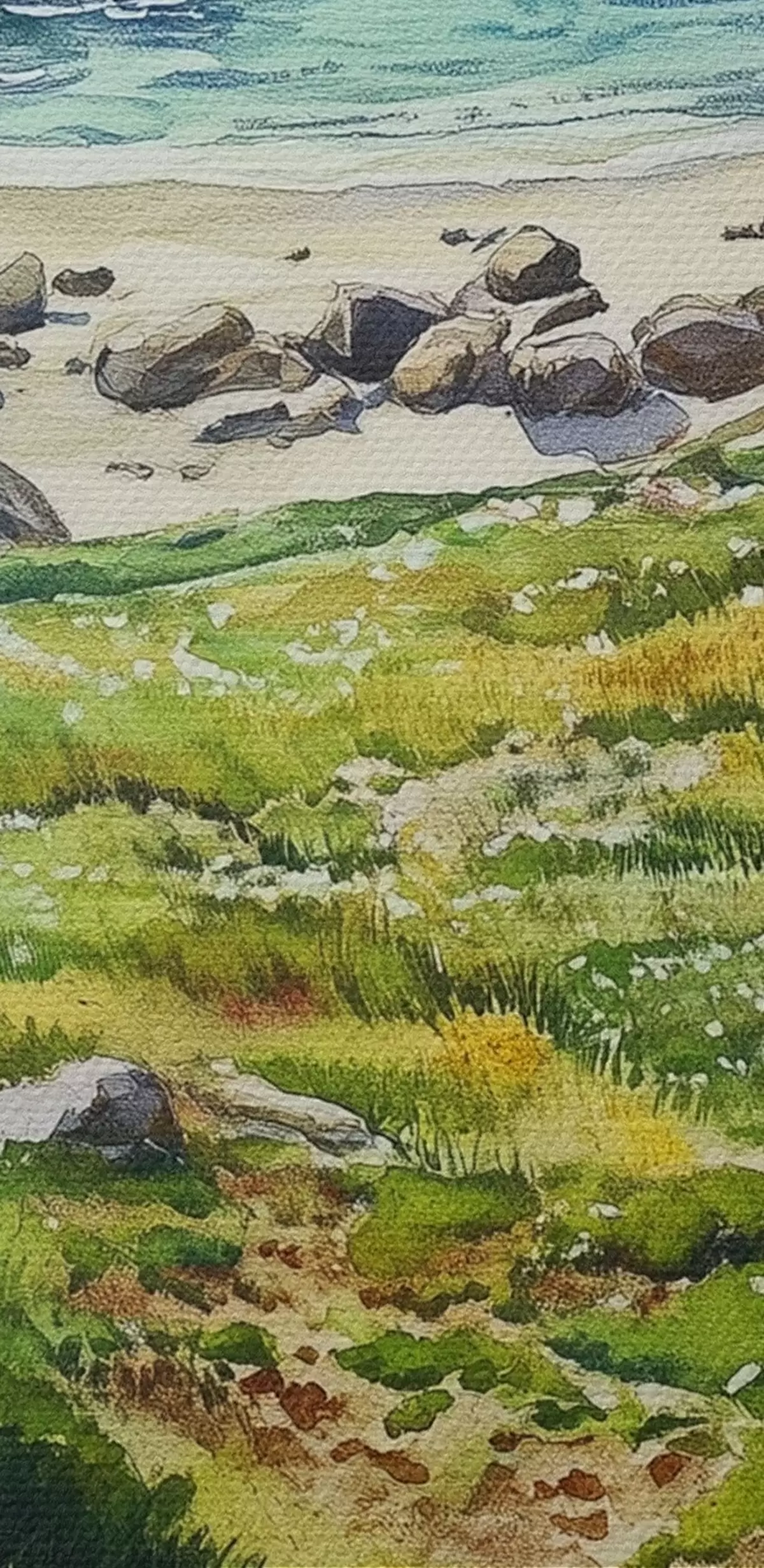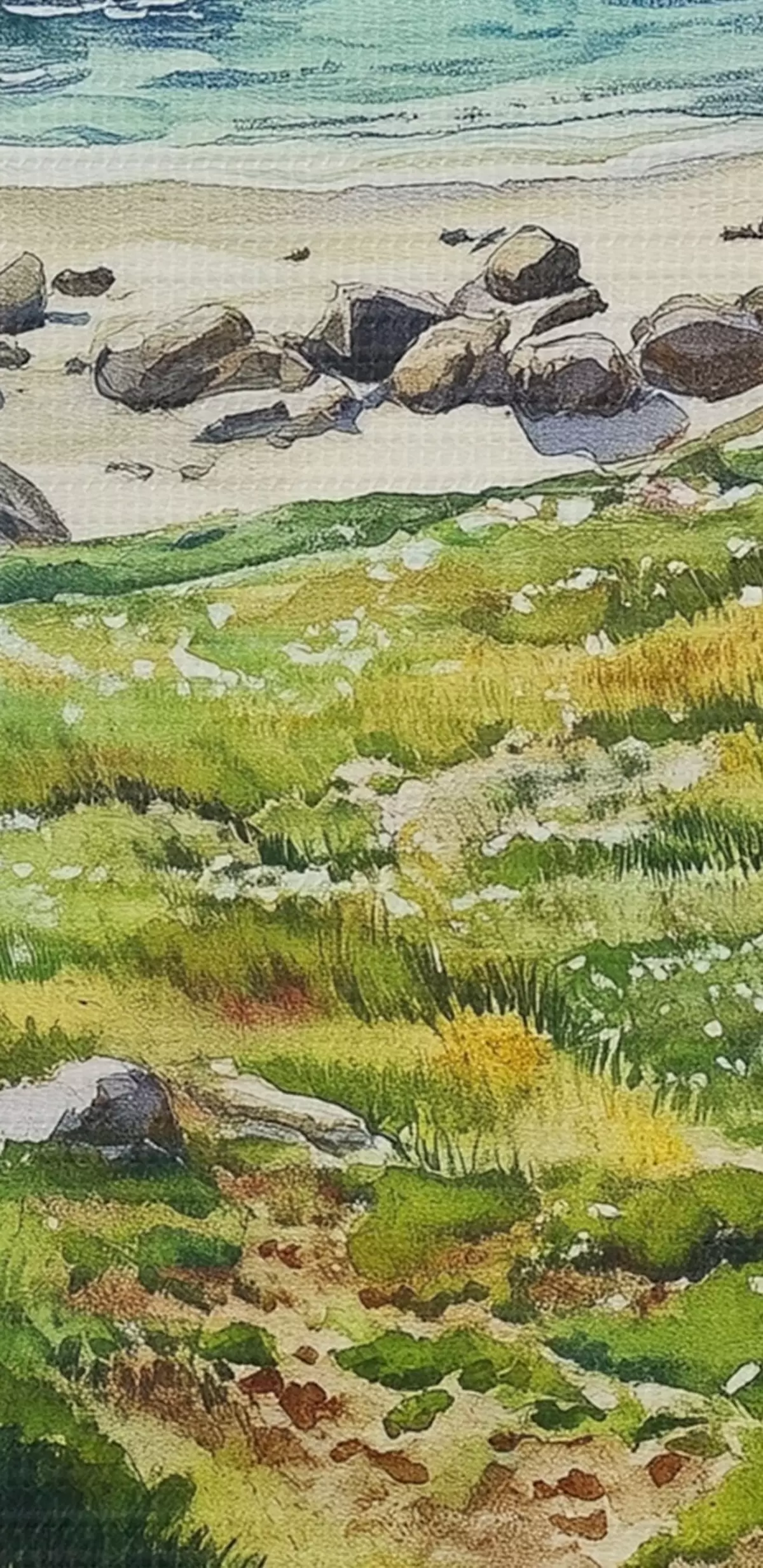 Runde Wandbilder Meeresküste mit Felsen und grünem Gras, Aquarellstil, Sommer r44616