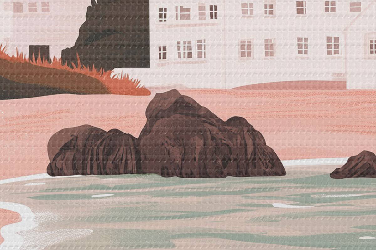 Runde Wandbilder Gemütlicher rosa Strand mit weißen Häusern und Muscheln r44713