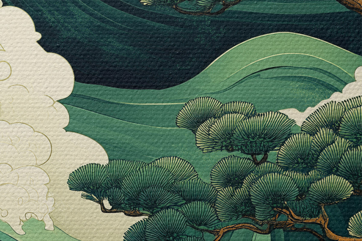 Runde Wandbilder Zeichnung im chinesischen Stil mit Meereswellen und Pinienbäumen Nr r44719