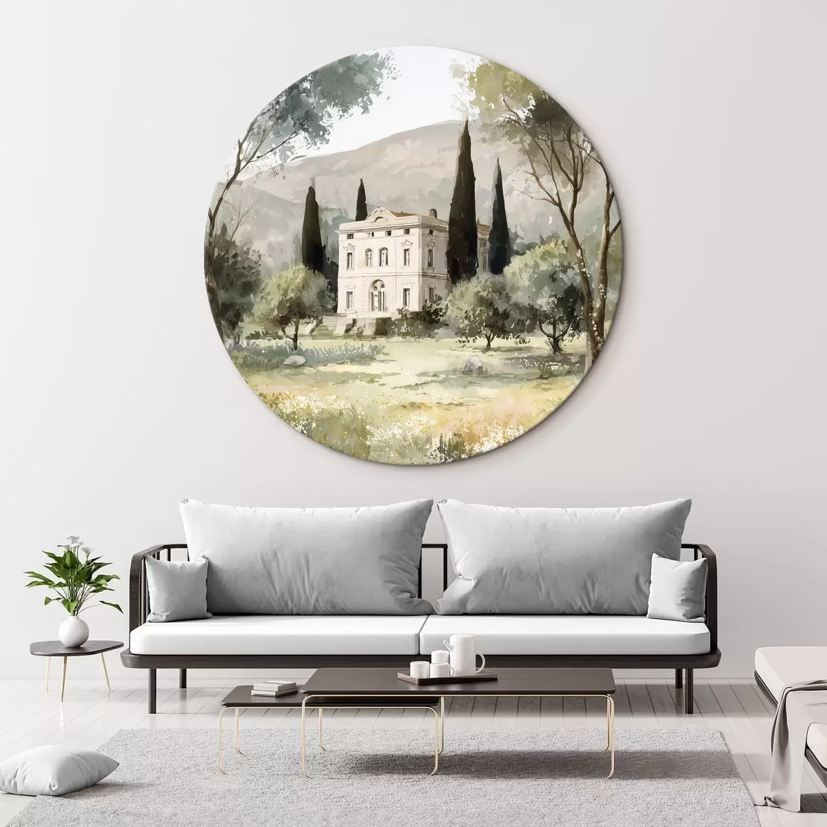 Runde Wandbilder Mediterranes Dorf mit weißem Haus umgeben von einem Garten Nr r44796