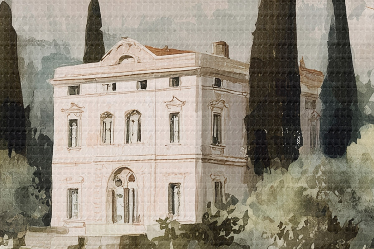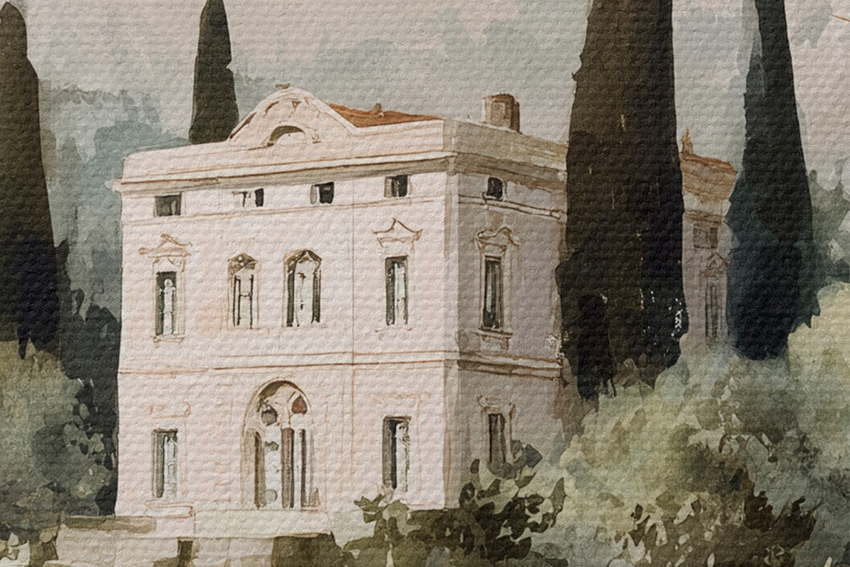 Runde Wandbilder Mediterranes Dorf mit weißem Haus umgeben von einem Garten r44796