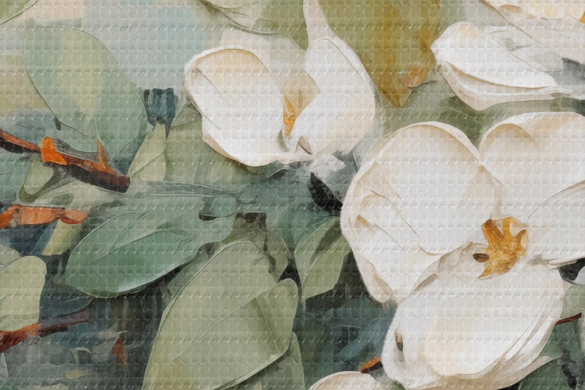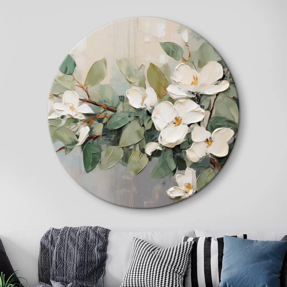 Runde Wandbilder Magnolienblüten mit grünen Blättern auf einem Zweig, pastos strukturierter Stil, weiche Farbpalette r44853