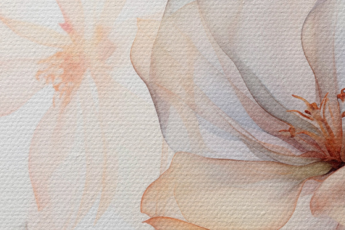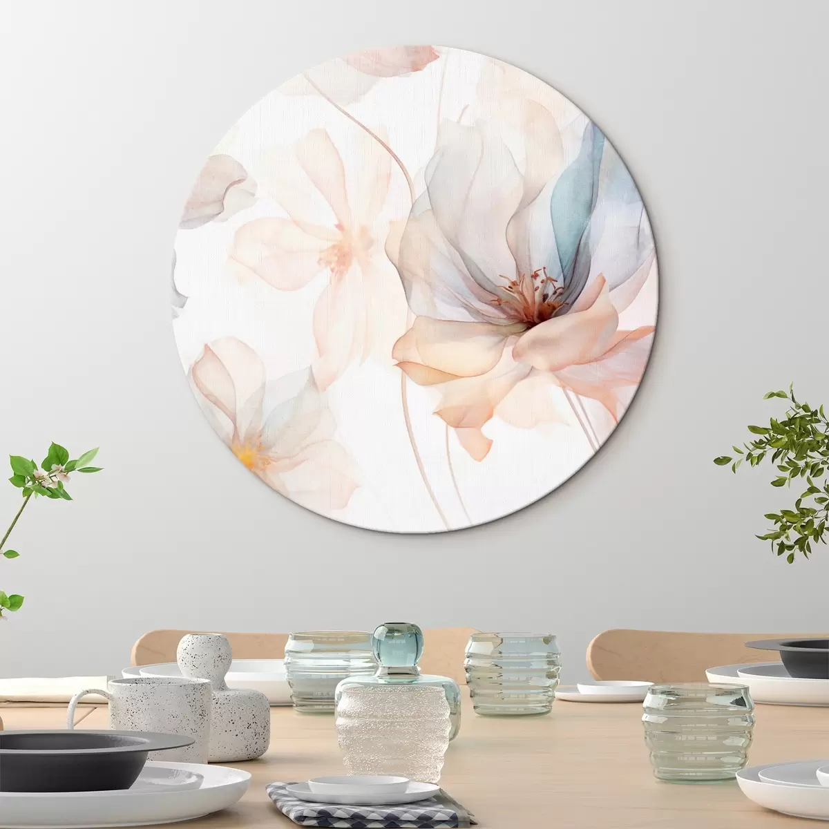Runde Wandbilder Transluzente, strukturierte Blumen in Pastellfarben, zarte Blütenblätter, feine Linien auf weißem Hintergrund r44855